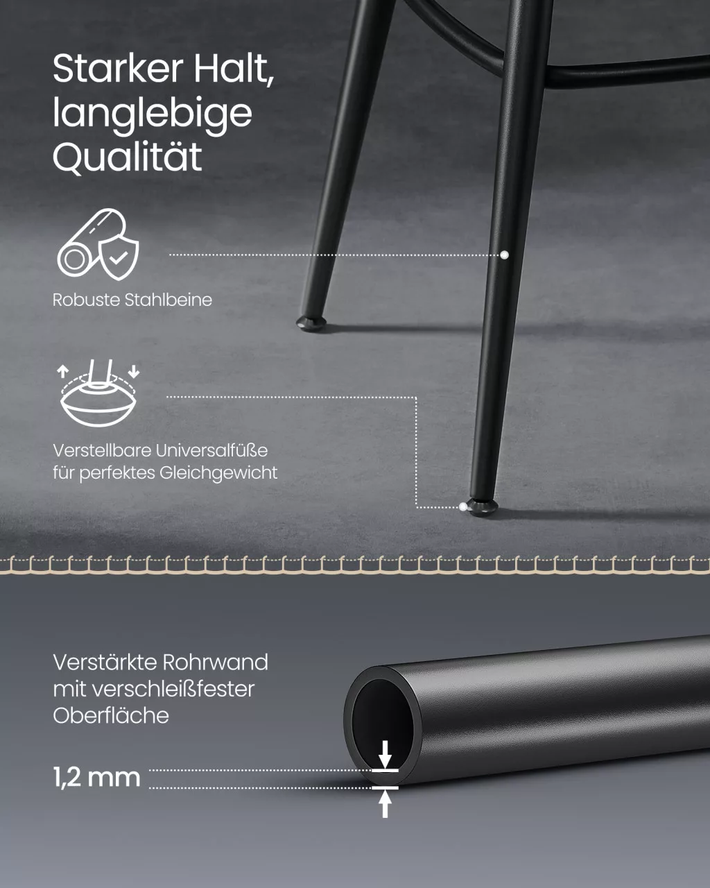 A kifelé álló fém lábak stabil alapot képeznek, míg az állítható talpak biztosítják az egyensúlyt egyenetlen felületeken is, és megvédik a padlót a karcolásoktól. A vízálló műbőr borítás rendkívül könnyen tisztítható, így a bárszékek hosszú ideig megőrzik eredeti szépségüket. A matt fekete acél lábak karcolásállóak, így a termék évekig megőrzi prémium megjelenését. Ez a 2 darabos szett tökéletes választás konyhapultokhoz, házi bárokhoz vagy szórakoztató terekbe.