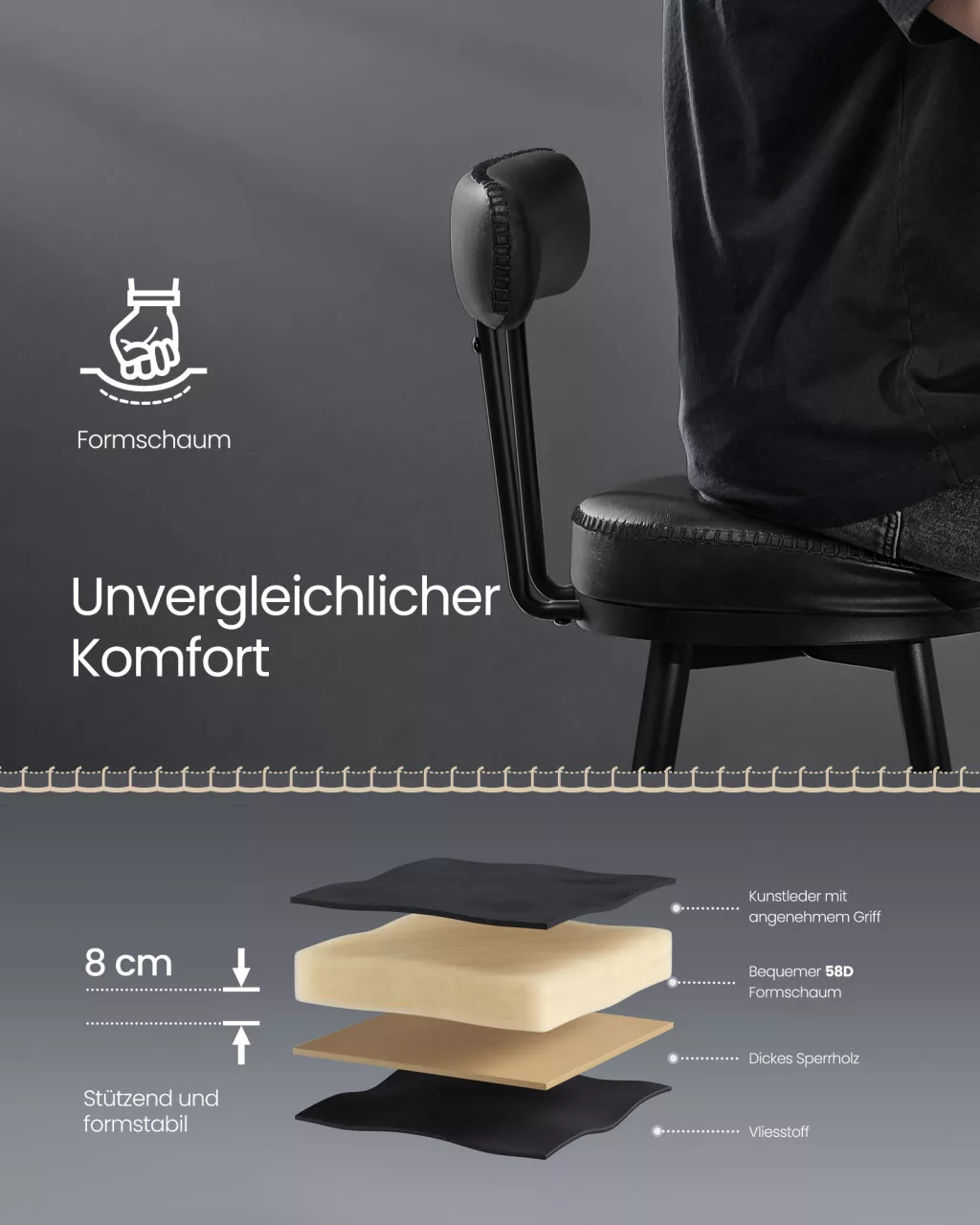 A VASAGLE EKHO bárszékek a mid-century modern stílus és a praktikus funkcionalitás tökéletes ötvözetét képviselik. A gazdag textúrájú műbőr borítás finom varrásokkal díszítve nemcsak elegáns megjelenést biztosít, hanem tartós használatot is garantál. A 8 cm vastag, 58D sűrűségű habpárnázat hosszú órákig tartó kényelmet nyújt, legyen szó reggeli kávéról vagy esti társasági eseményről. A 360°-ban forgatható ülőke lehetővé teszi a szabad mozgást és interakciót, így minden pillanatban kapcsolatban maradhat környezetével.