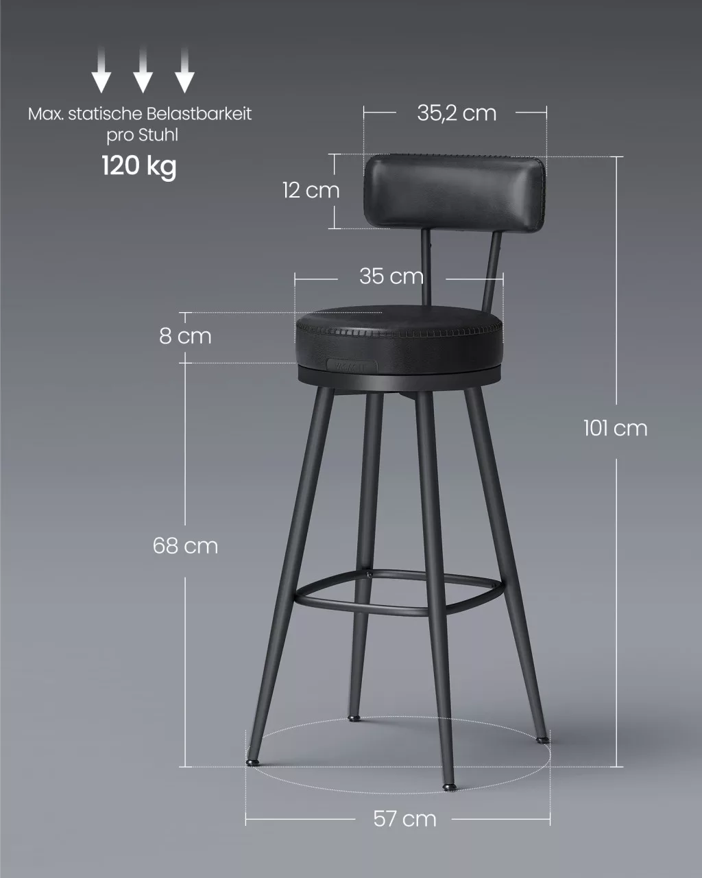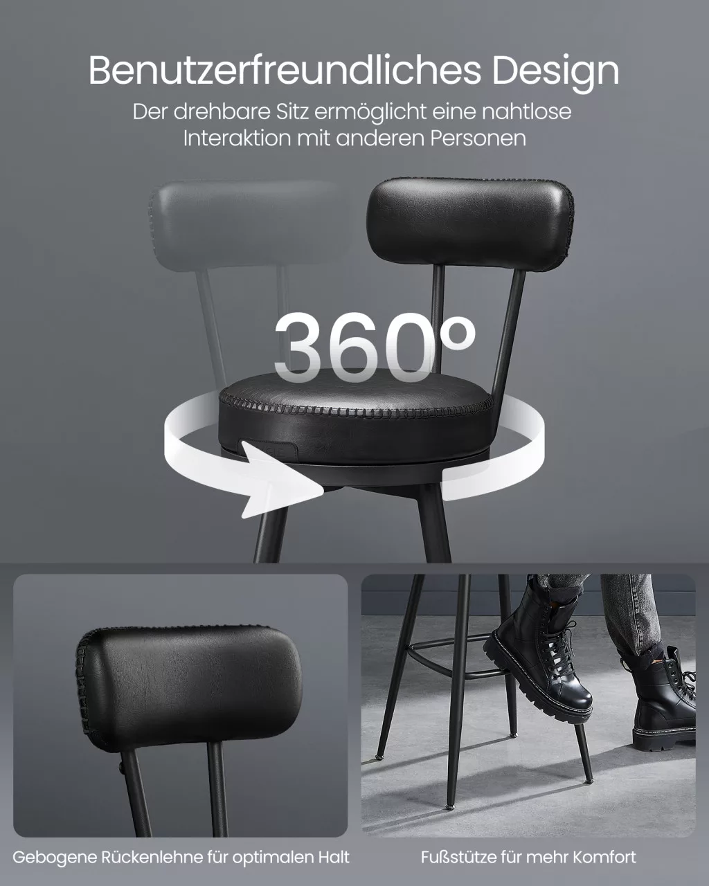 A VASAGLE EKHO kollekcióból származó bárszékek tökéletes választást kínálnak modern konyhákba és bárpultokhoz. A 360°-ban forgatható, támlás kialakítás és a vastag habpárnázat maximális kényelmet biztosít, miközben a tintafekete műbőr borítás elegáns megjelenést kölcsönöz.