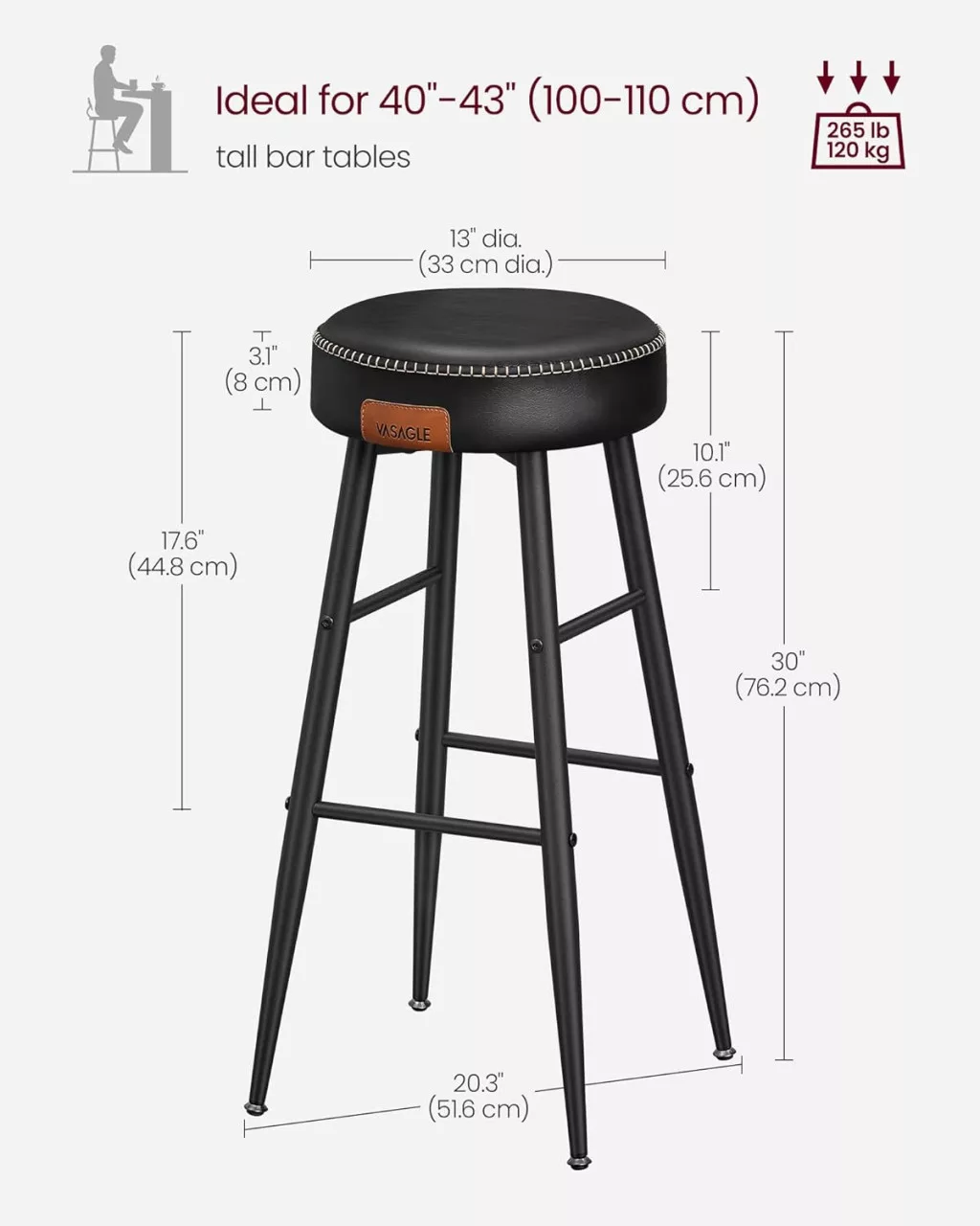 VASAGLE Echo Collection ULBC090B01 bárszék 2 db-os szett műbőr fekete 76 cm magas