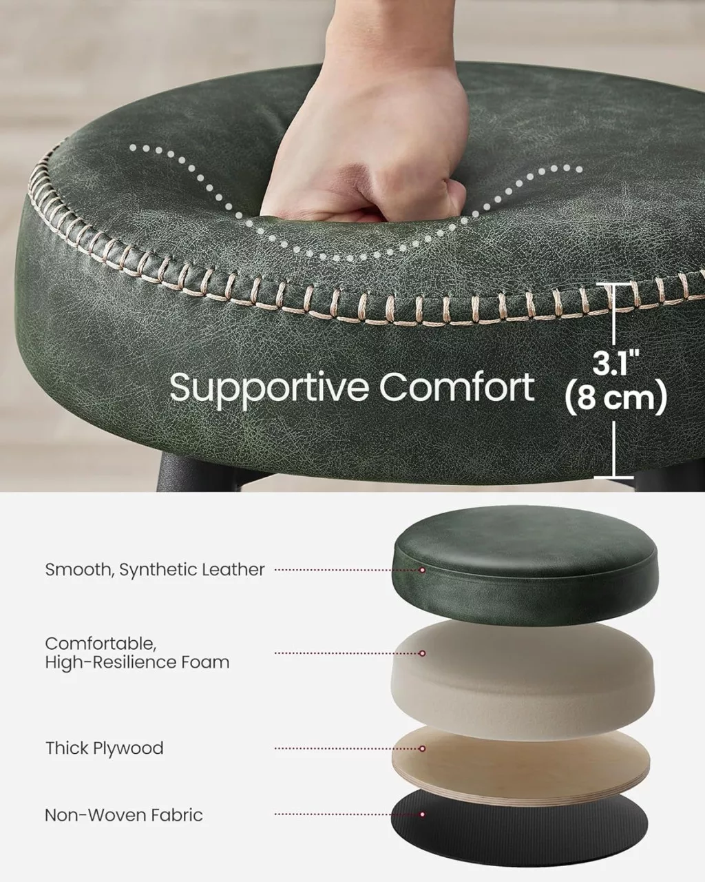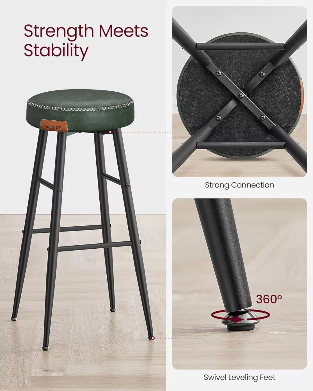 A VASAGLE Echo Collection bárszékek tökéletes harmóniát teremtenek a stílus és a funkcionalitás között. Az erdőzöld műbőr kárpit finom varrásokkal díszített, míg az elegáns, kúpos acél lábak modern megjelenést kölcsönöznek. A 7,8 cm vastag, nagy rugalmasságú habszivacs ülőfelület hosszan tartó kényelmet biztosít, így akár reggelinél, akár baráti összejöveteleken ülünk, mindig kellemes élményben lesz részünk.