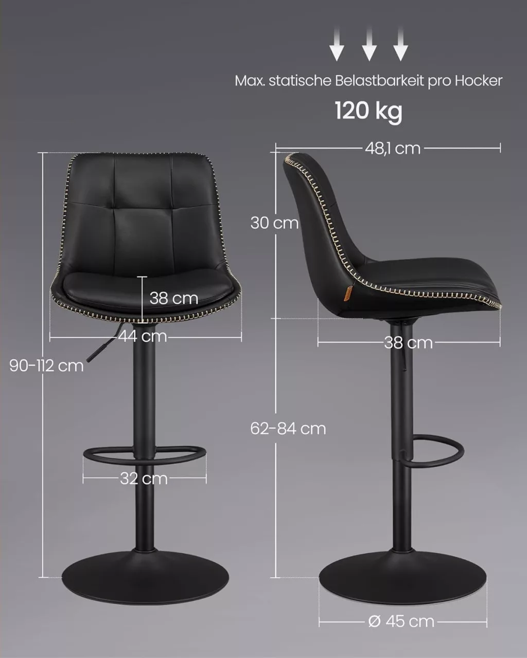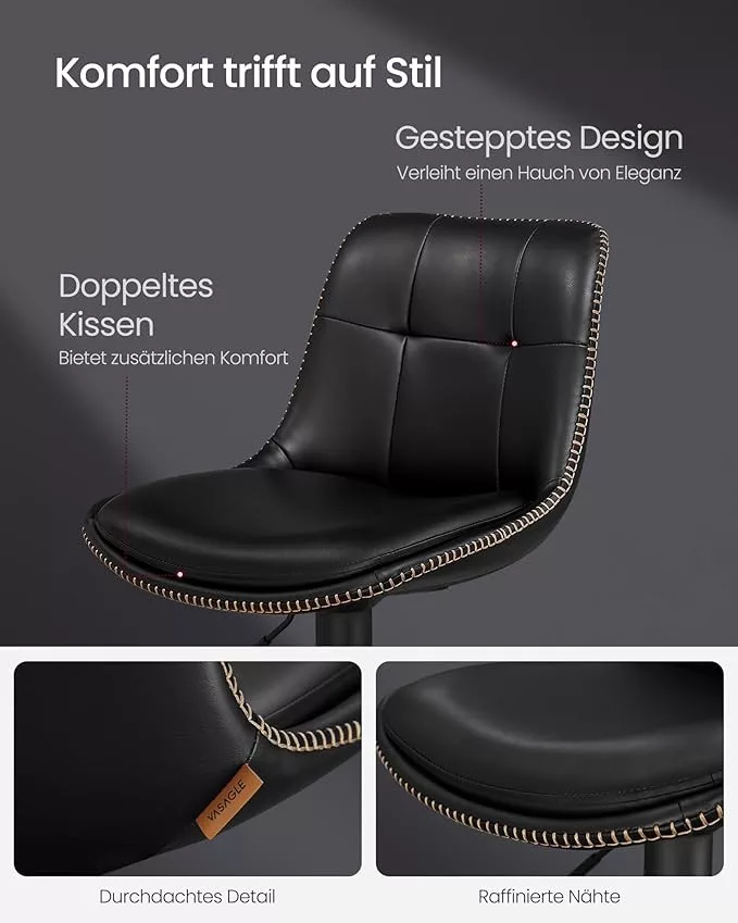 A VASAGLE bárszék szett elegáns megjelenést kölcsönöz konyhájának vagy bárpultjának a steppelt fekete PU bőr kárpitozással és a króm díszítőelemekkel. A dupla párnázású ülőfelület és az ergonomikus háttámla hosszan tartó kényelmet biztosít, míg a 360 fokos forgathatóság és állítható magasság maximális rugalmasságot nyújt.