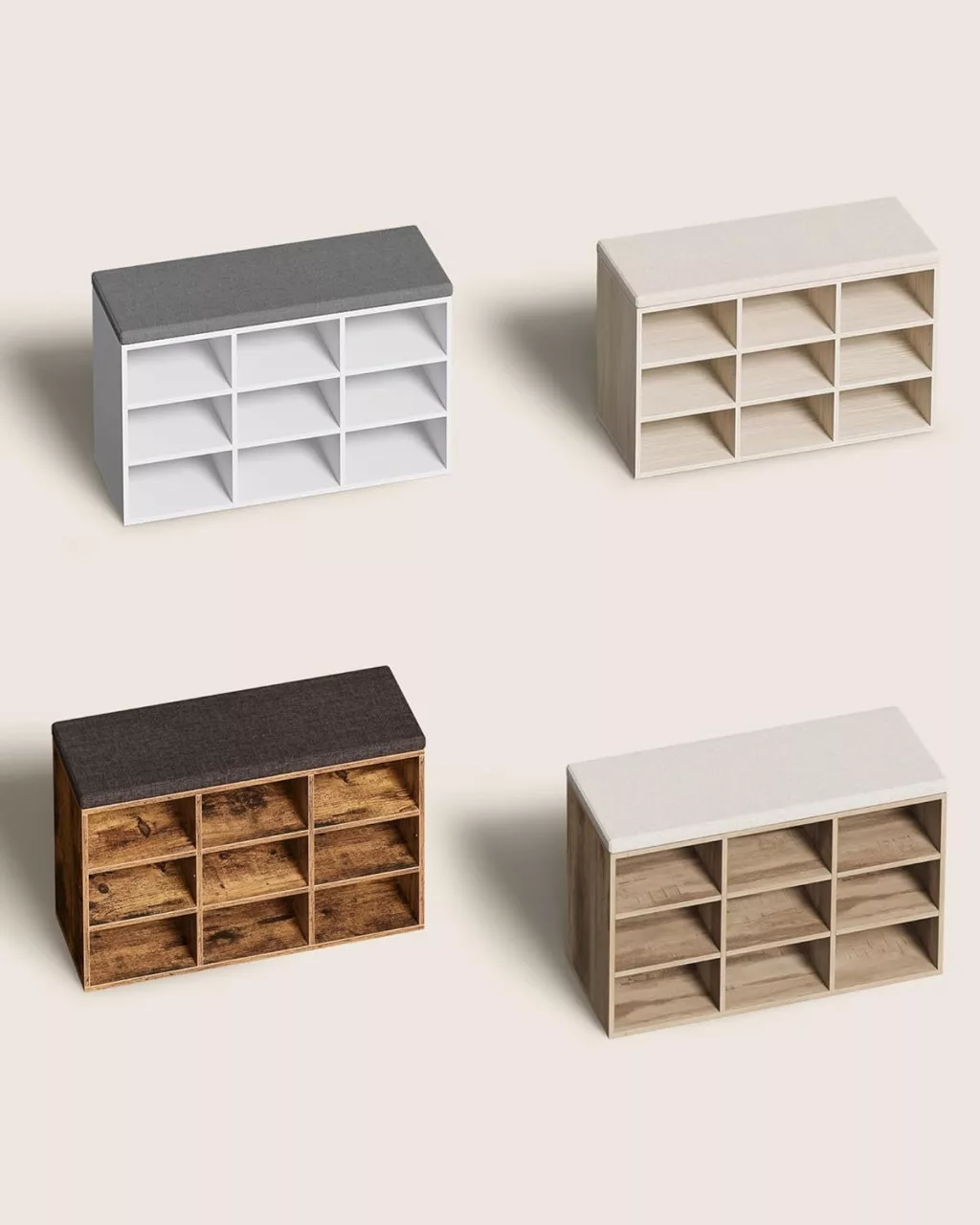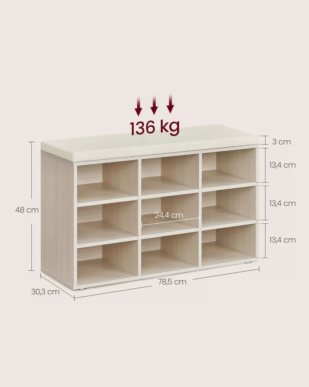 Ez az elegáns cipőtároló pad egyesíti a praktikus tárolást a kényelmes ülőfelülettel. A 9 tágas rekesz lehetővé teszi akár férfi cipők rendezett tárolását is, míg a párnázott, levehető huzattal ellátott ülőfelület kényelmes helyet biztosít a cipők fel- és levételéhez.