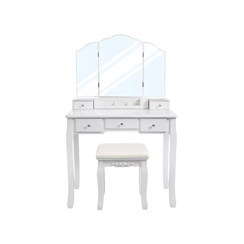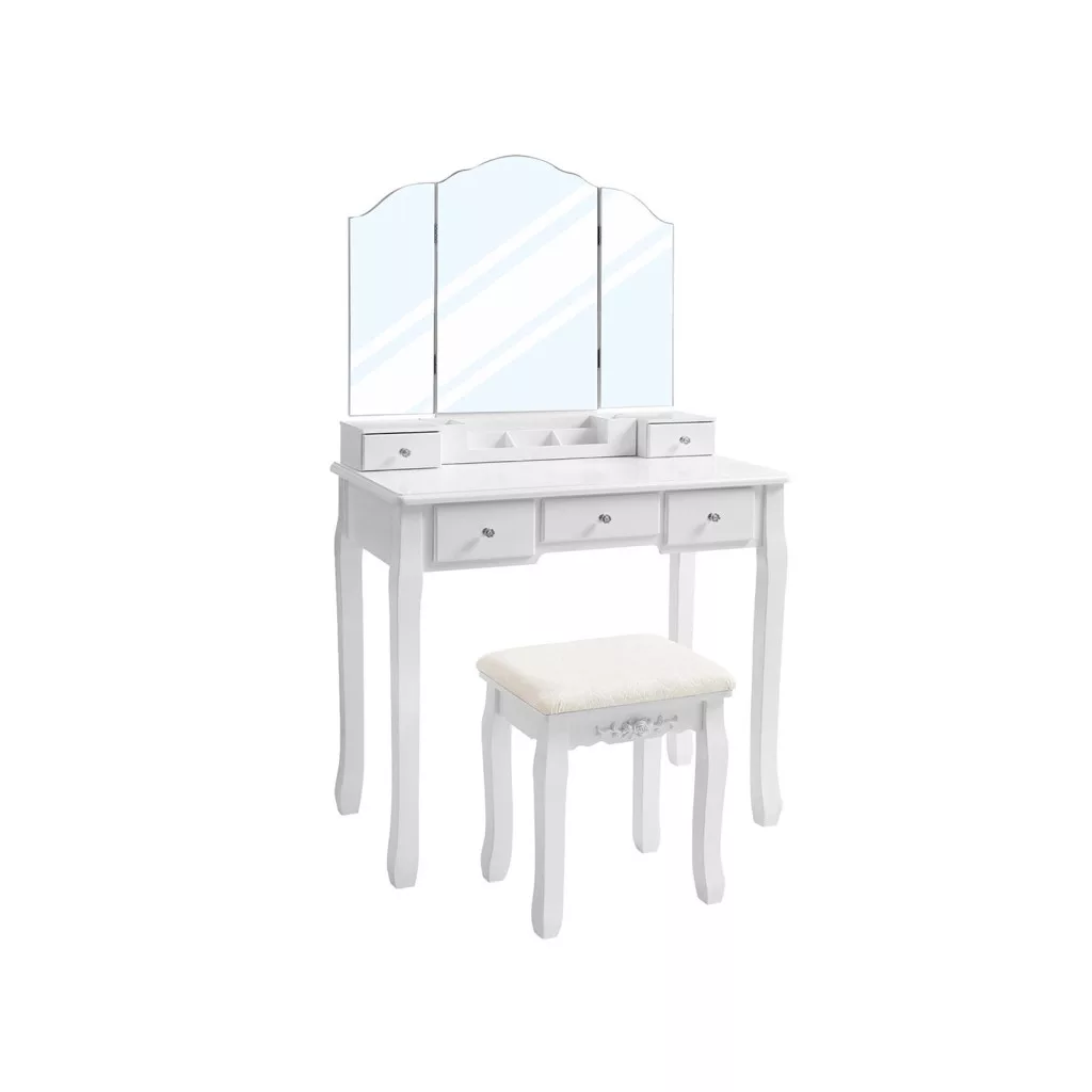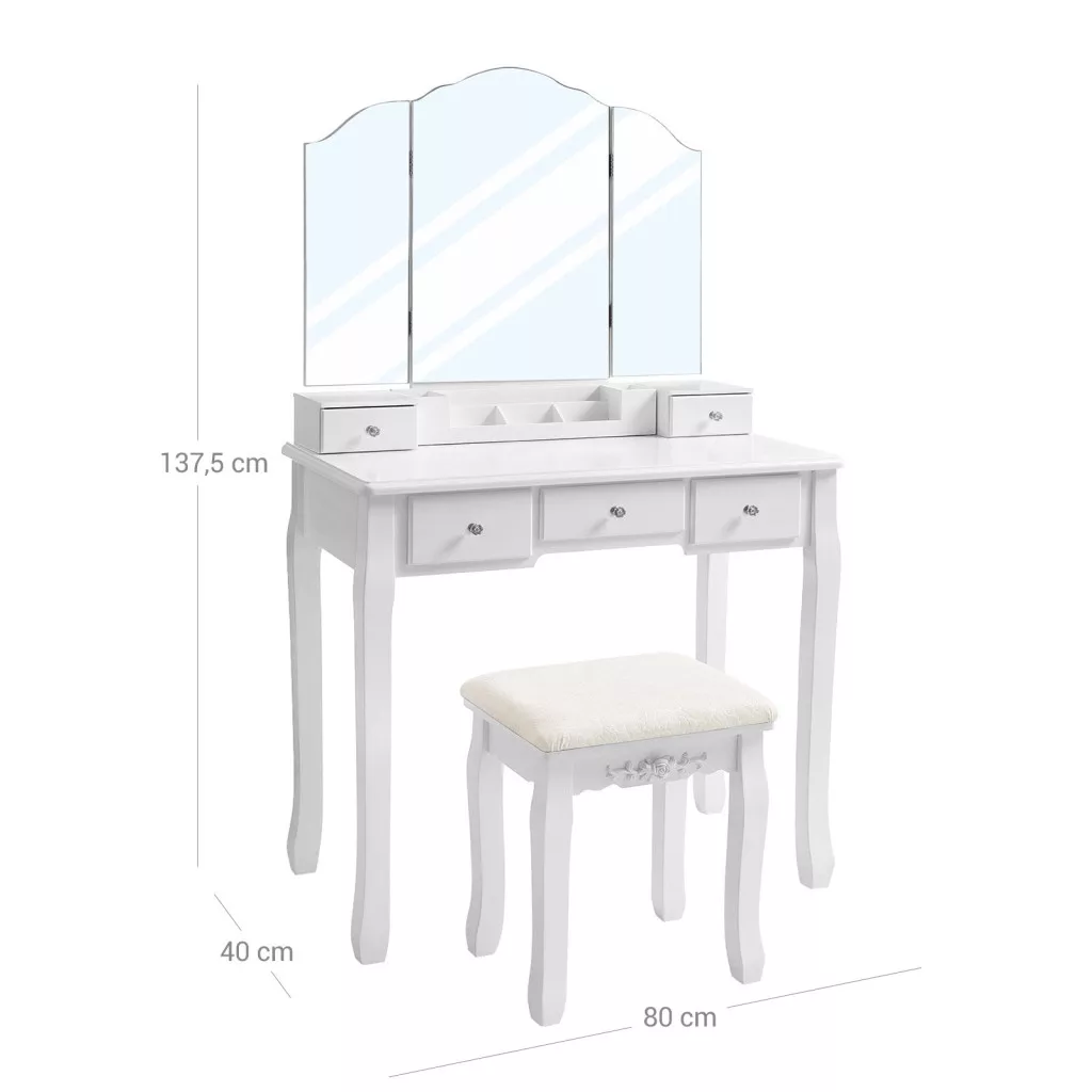 VASAGLE Elegance Fehér Fésülködőasztal Háromrészes Tükörrel és Ülőkével