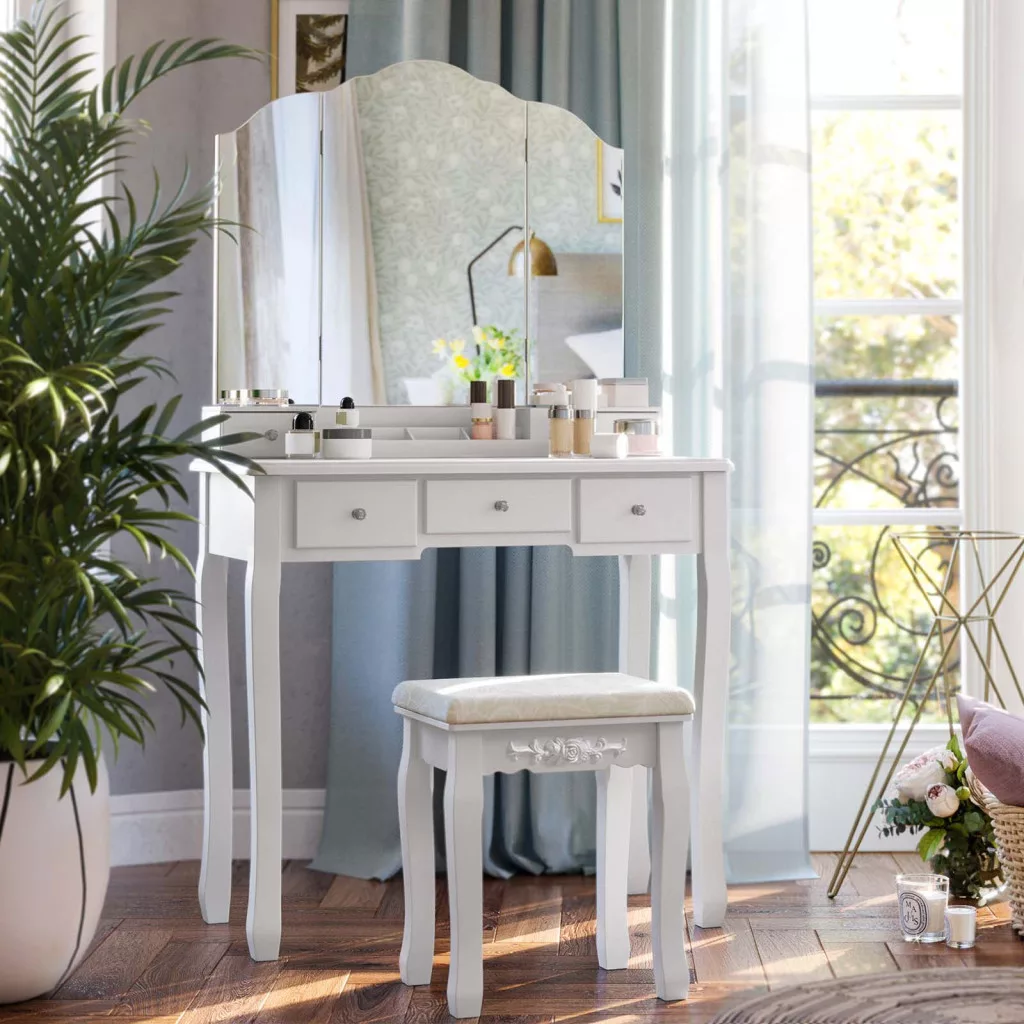 Elegáns fehér fésülködőasztal 5 fiókkal, háromrészes tükörrel és kényelmes ülőkével, amely tökéletes megoldást nyújt a szépségápolási termékek rendszerezett tárolására és a mindennapi szépségápolási rutinhoz.