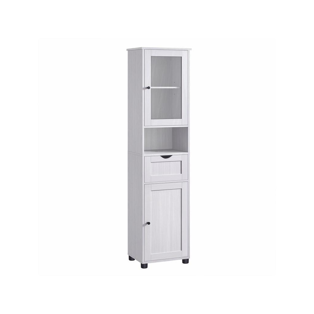 Ez a karcsú, mégis tágas fürdőszobai oszlopszekrény tökéletes megoldást nyújt a fürdőszobai kellékek rendszerezett tárolására. Az üvegajtós felső rész lehetővé teszi a gyakran használt tárgyak gyors elérését, míg az állítható polcok rugalmas tárolási lehetőséget biztosítanak.