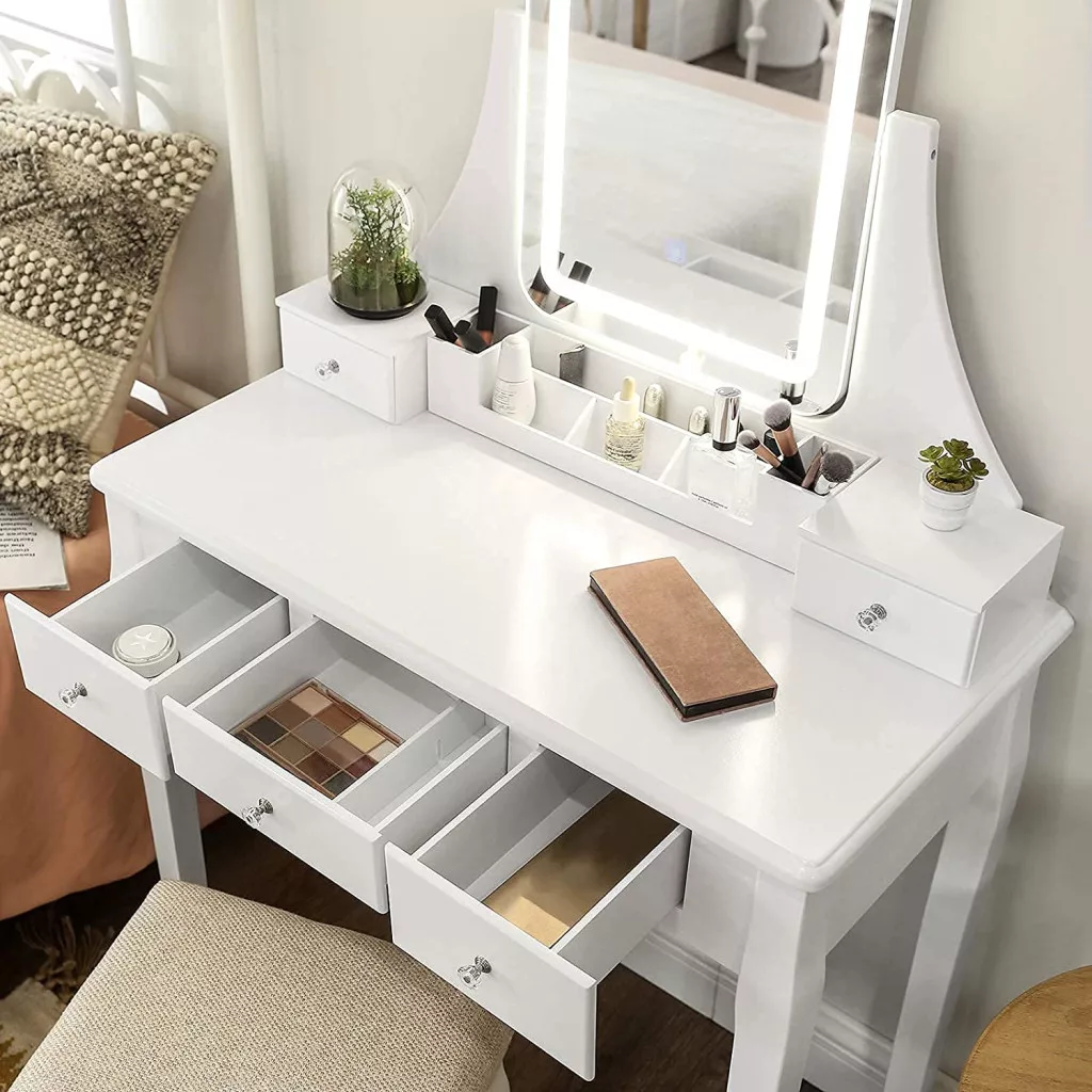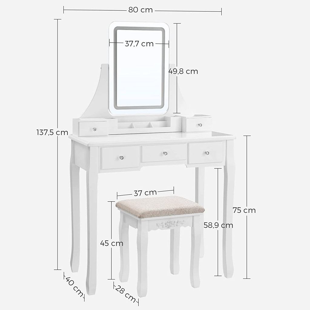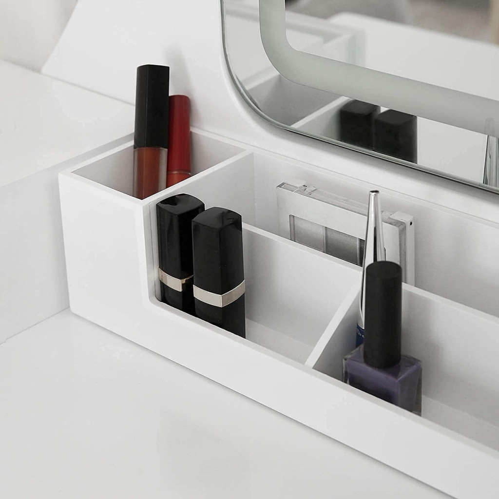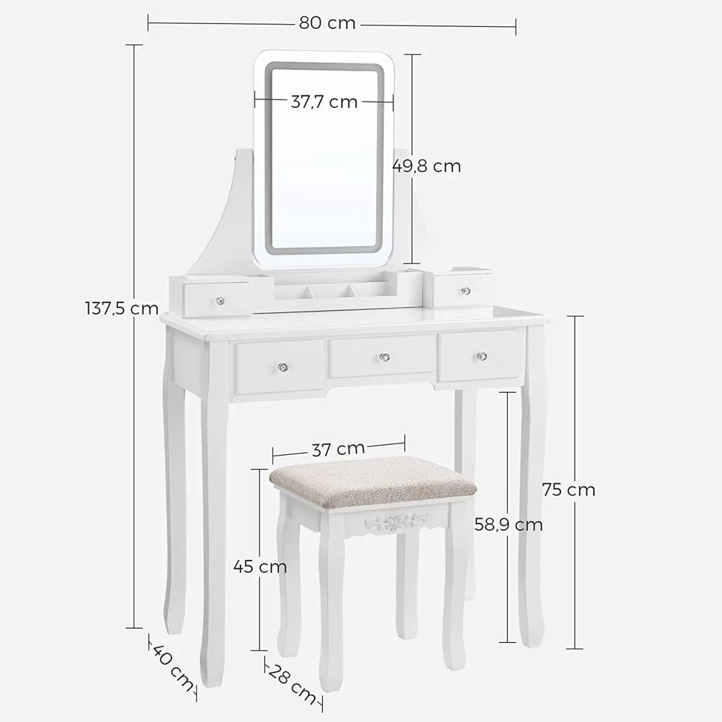 Az öt fiók és a kivehető rendszerező tálca bőséges tárolóhelyet biztosít kozmetikumainak és szépségápolási termékeinek. A párnázott ülőke kényelmes helyet biztosít a napi szépségápolási rutin során, míg a stabil szerkezet és a dönthető tükör maximális biztonságot nyújt.
