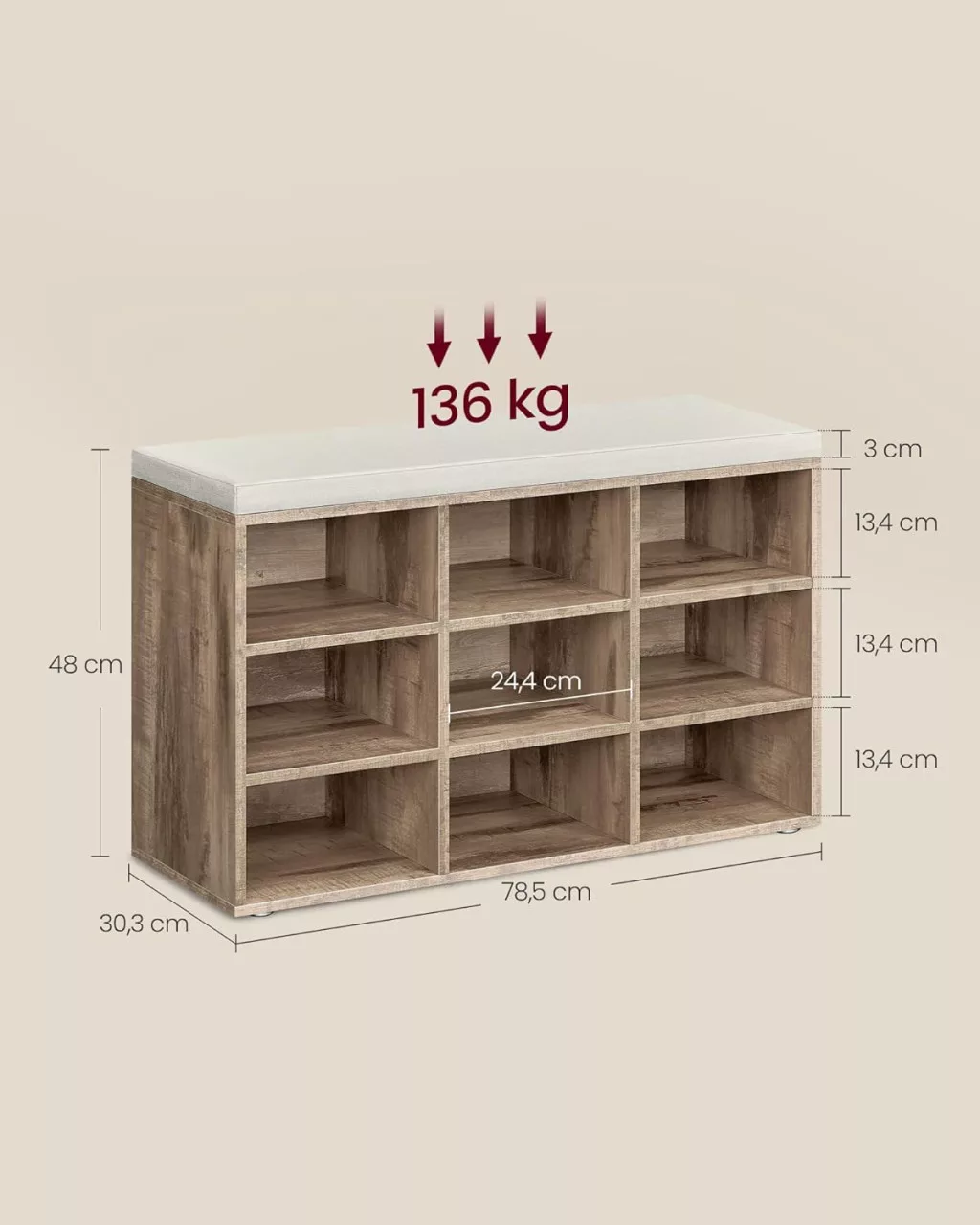 Stílusos és praktikus előszobai cipőspad 9 állítható rekesszel, kényelmes ülőpárnával és modern tevebarna kivitelben.
