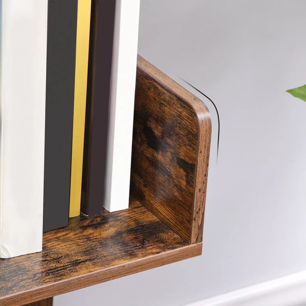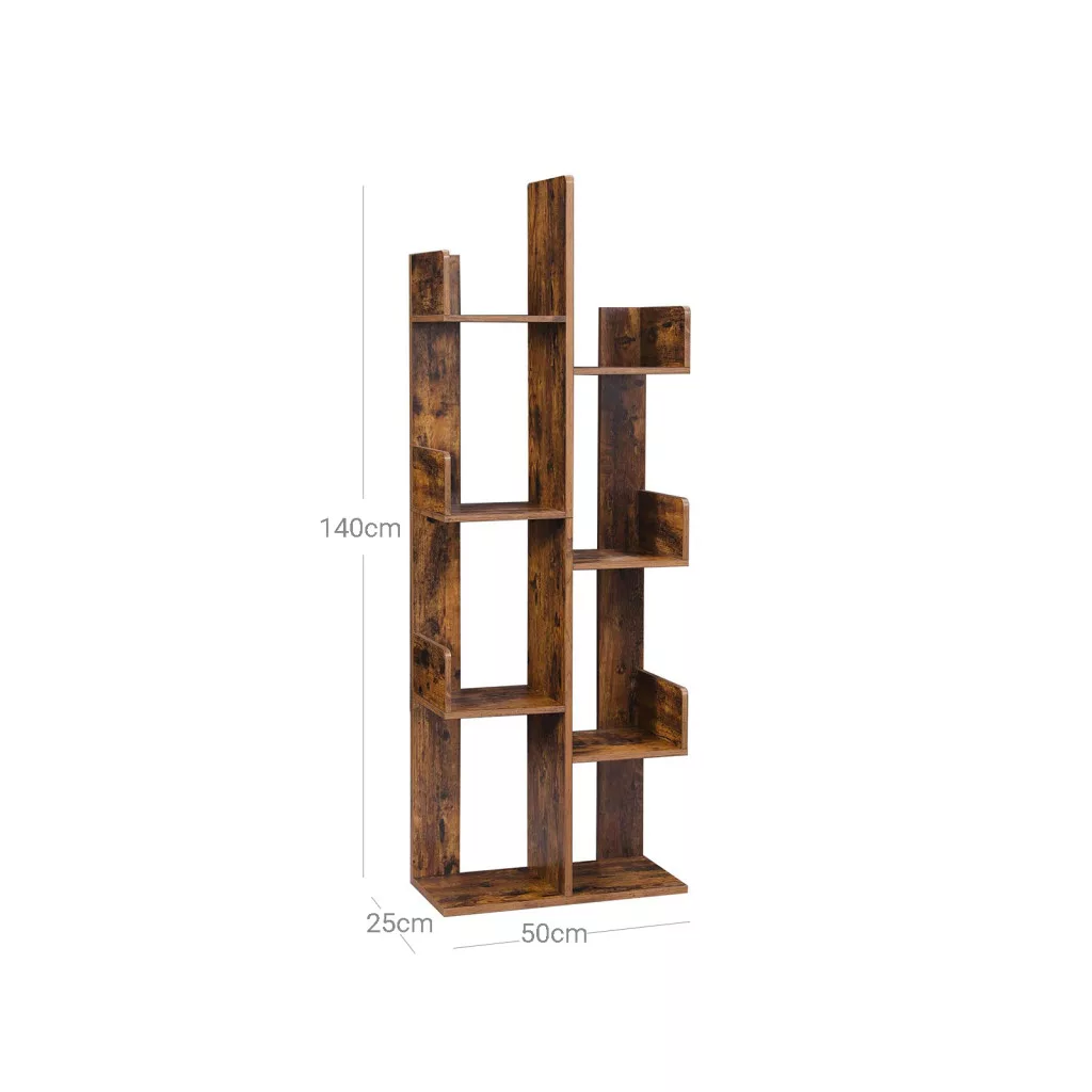 Elegáns, fa alakú könyvespolc 8 praktikus tárolórekesszel, amely tökéletes megoldást nyújt könyvek és dekorációs tárgyak tárolására rusztikus barna kivitelben.