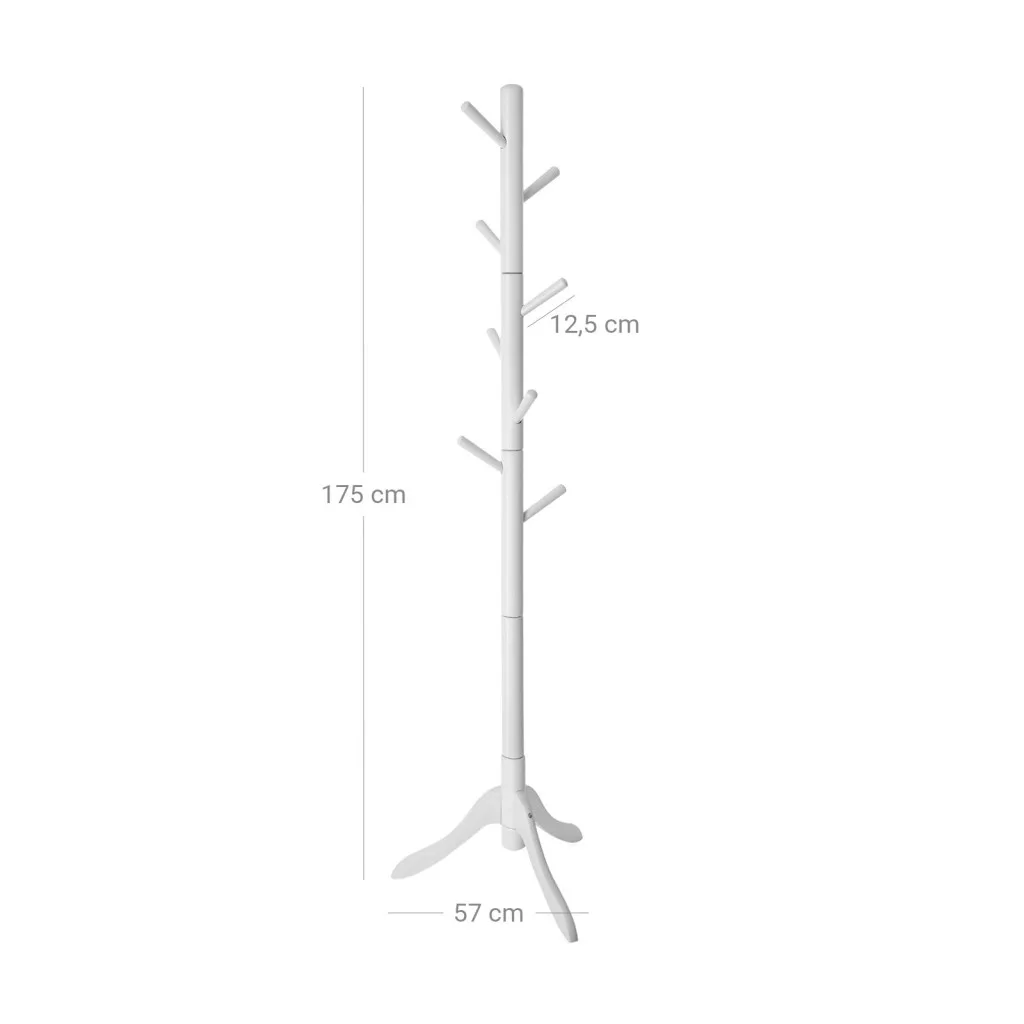 Ez a fehér, fából készült álló fogas tökéletes megoldást nyújt az előszoba vagy hálószoba rendezettségének megőrzéséhez. A 175 cm magas állvány 8 strapabíró akasztója ideális kabátok, táskák, kalapok és egyéb kiegészítők tárolására.