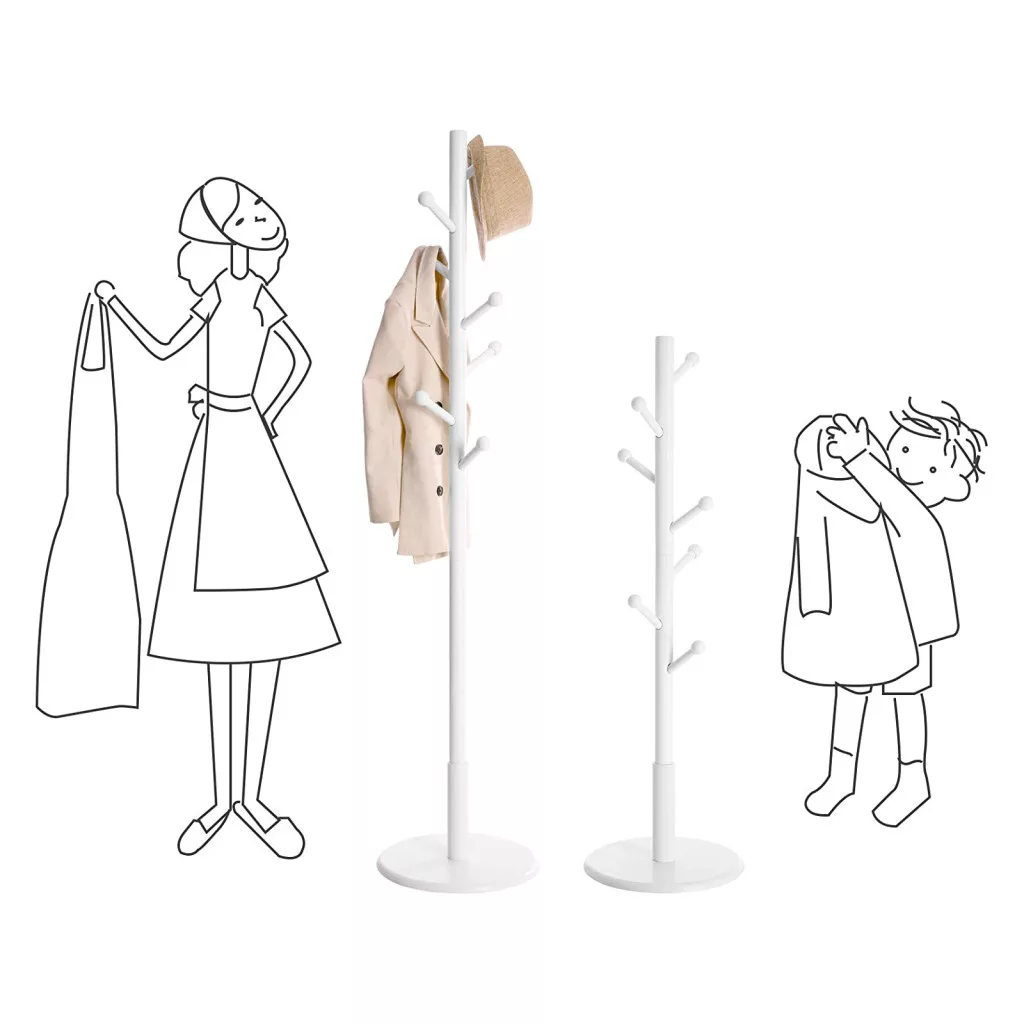 A különböző magasságokban elhelyezett 7 lekerekített akasztó lehetővé teszi, hogy a család minden tagja könnyen elérje azokat. A ruhafogas ideális kabátok, sálak, kalapok és táskák rendezett tárolására, miközben helytakarékos megoldást kínál.