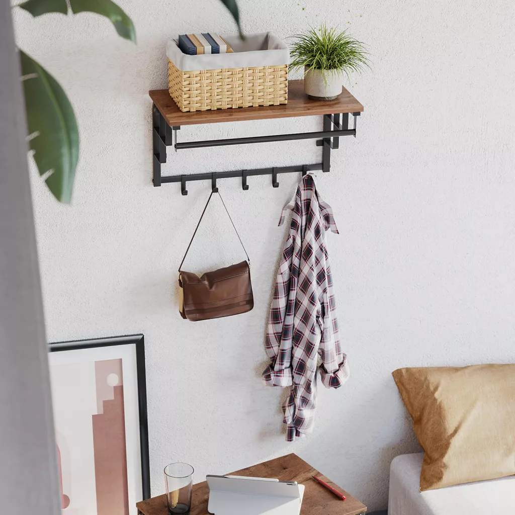 Többfunkciós fali fogas polccal, akasztórúddal és 5 kampóval, amely tökéletes megoldást nyújt kabátok, táskák és kiegészítők rendezett tárolására az előszobában vagy folyosón.