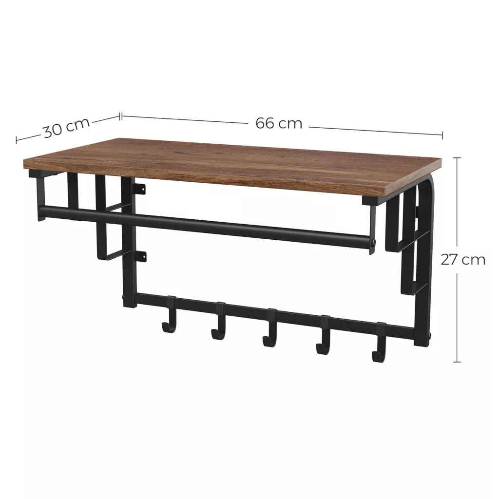 Ez a mogyoróbarna és fekete színkombinációjú fali fogas egyesíti a praktikumot az esztétikummal. A 66 cm széles polc bőséges helyet biztosít dekorációs tárgyaknak vagy mindennapi használati eszközöknek, míg az alatta található akasztórúd és az 5 kampó tökéletes megoldást kínál kabátok, táskák és egyéb kiegészítők tárolására.