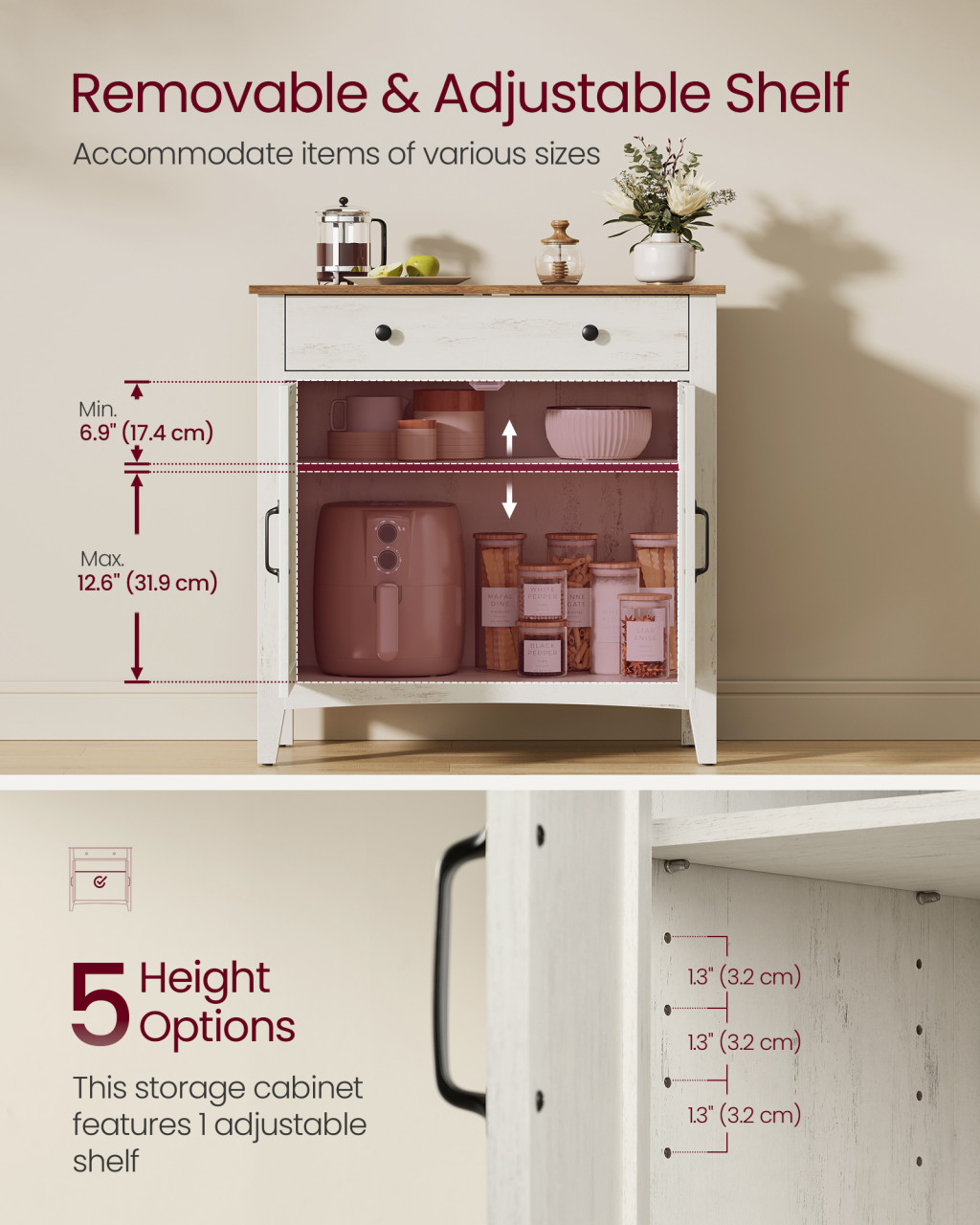 Sokoldalú tárolószekrény farmhouse stílusban, amely ötvözi a rusztikus fehér és mézbarna színeket, állítható polccal és tágas fiókkal a maximális tárolási rugalmasságért.