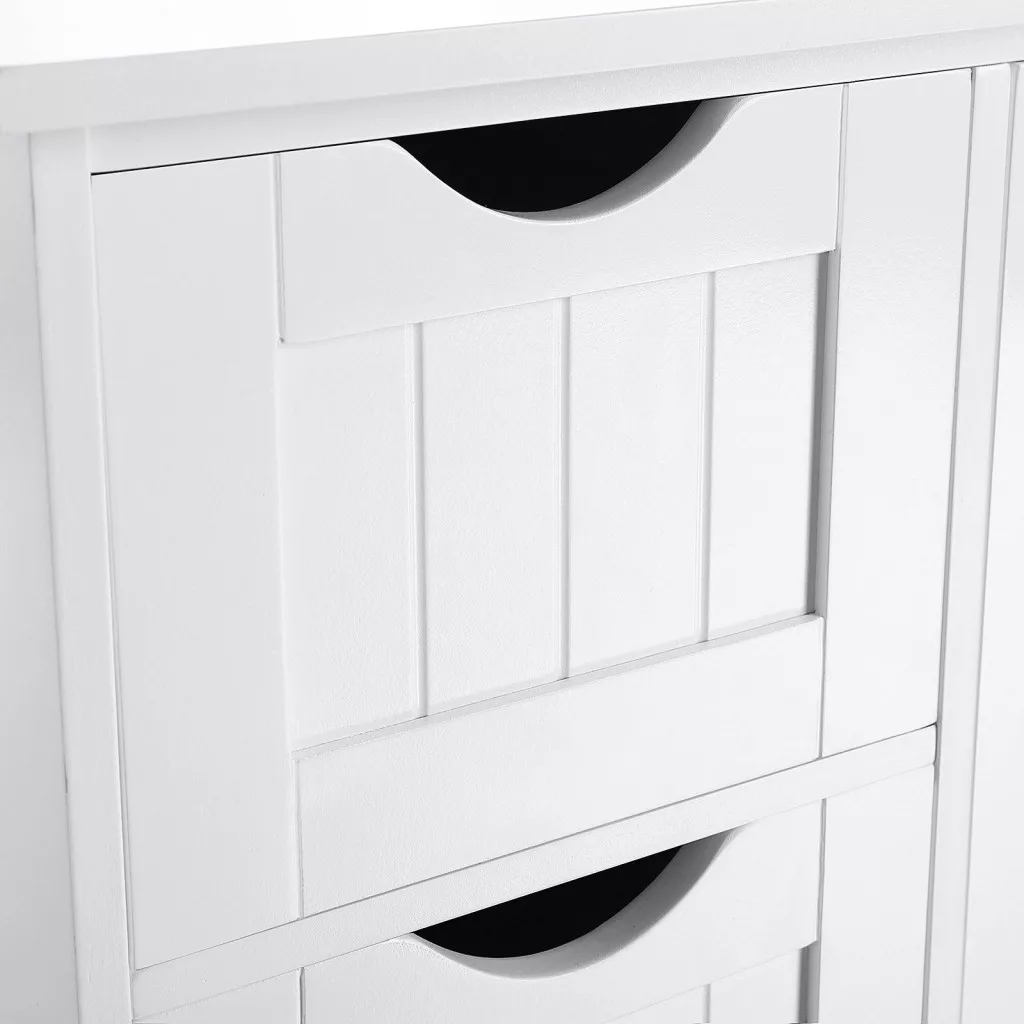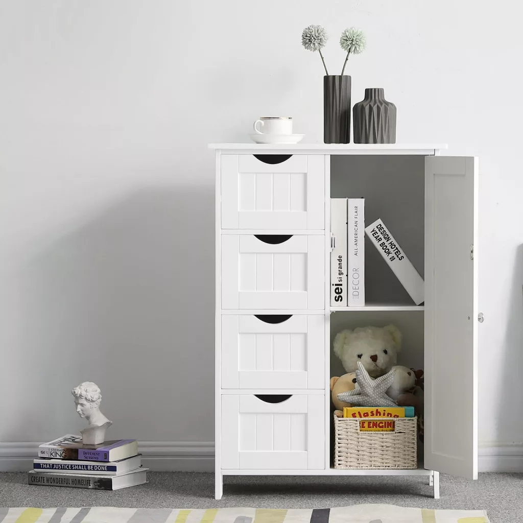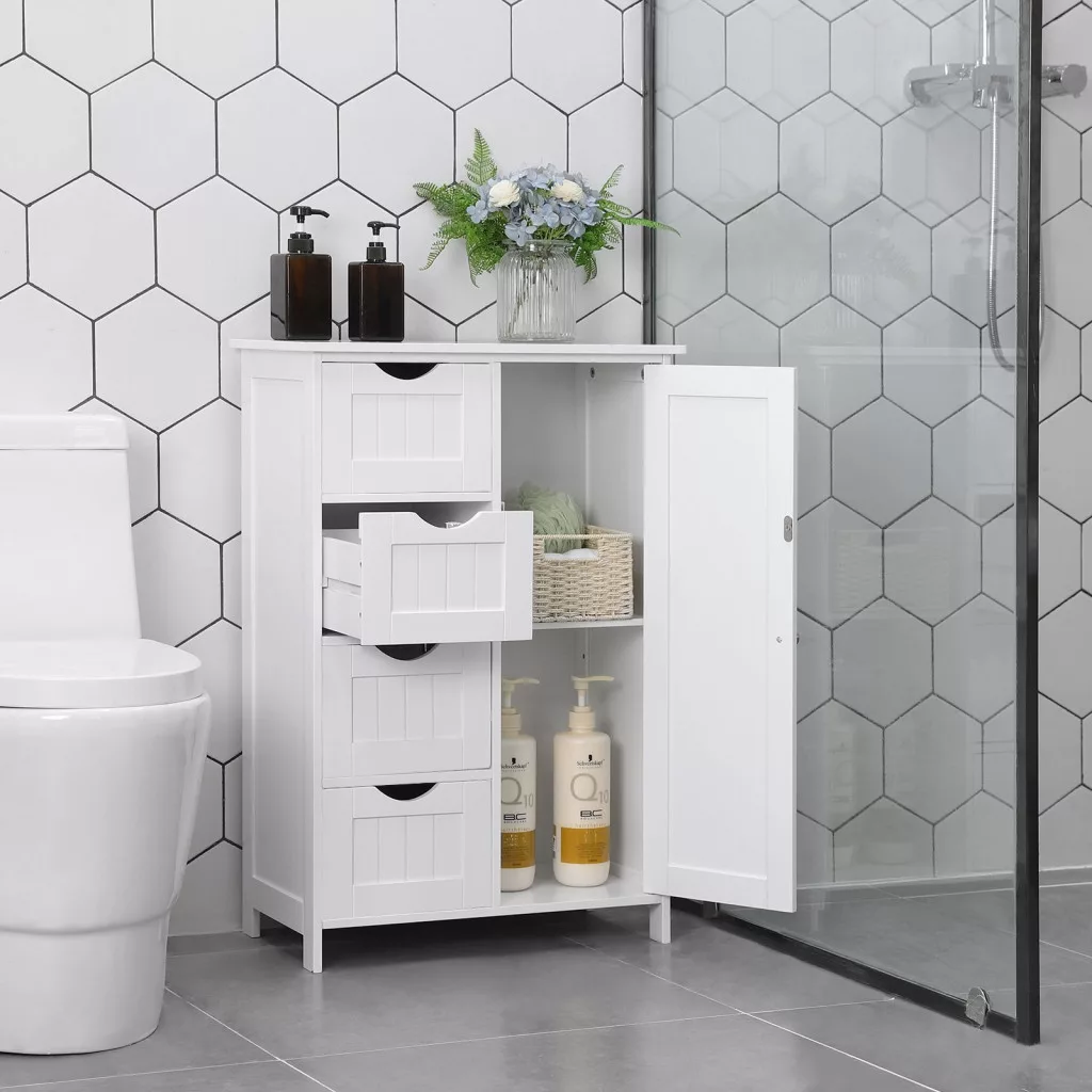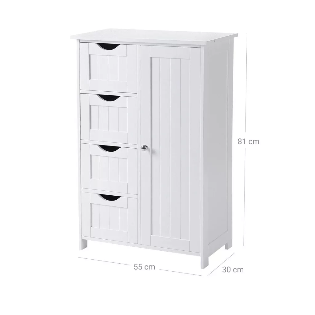 VASAGLE Fehér Fürdőszobai Tárolószekrény 4 Fiókkal és Állítható Polccal