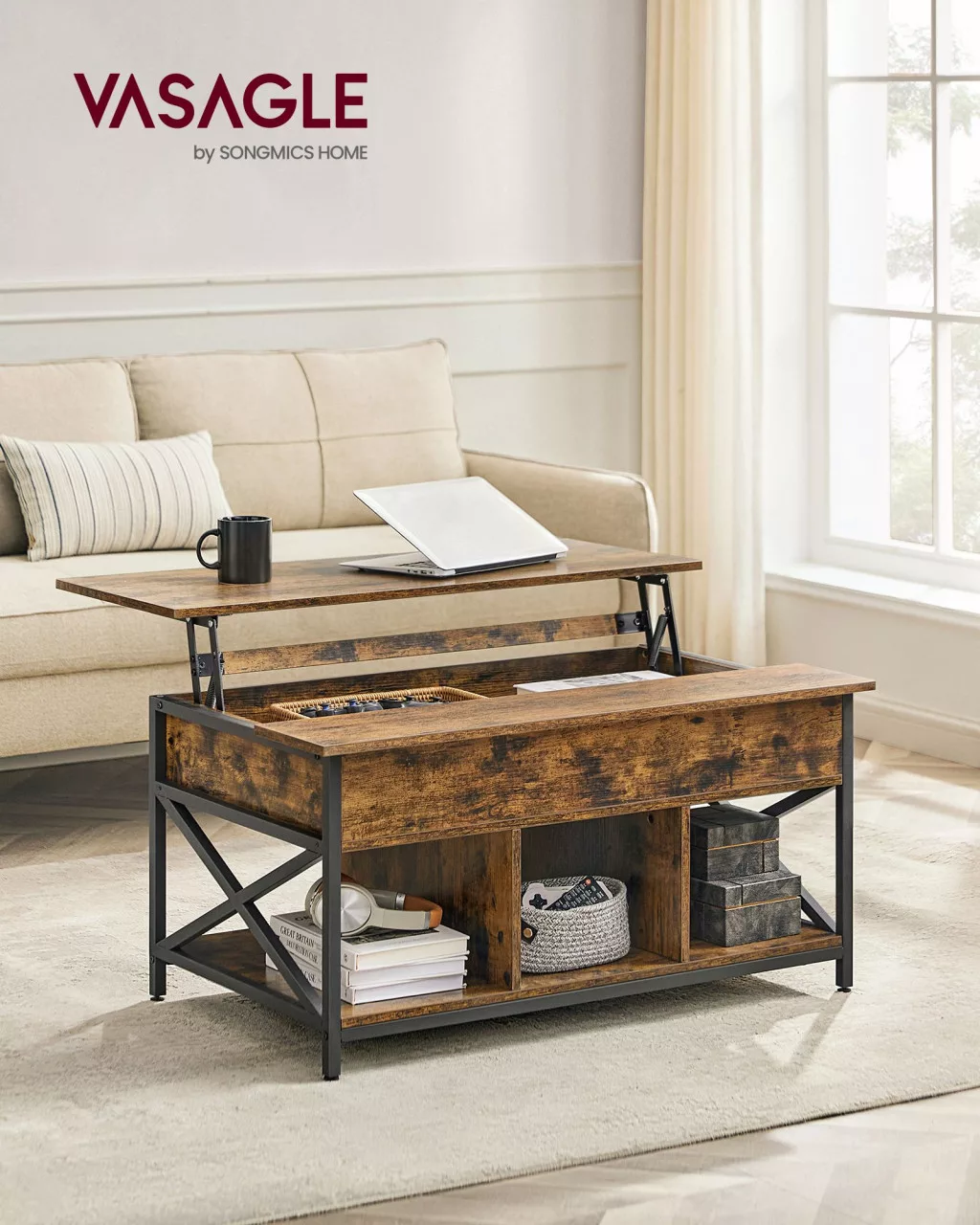 VASAGLE Felnyitható Dohányzóasztal Ipari Stílusú Tárolóval Rusztikus Barna-Fekete