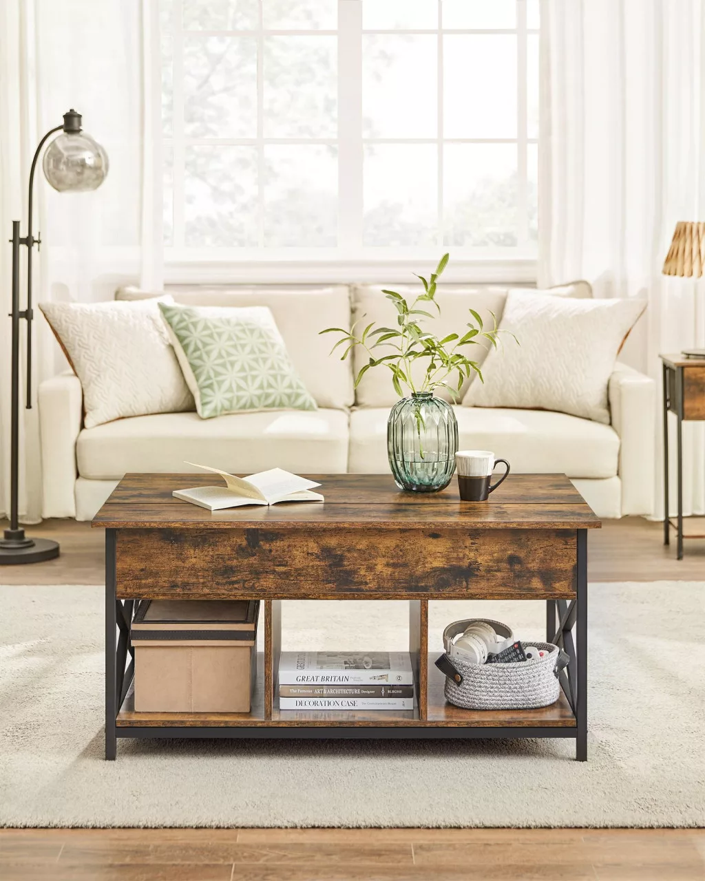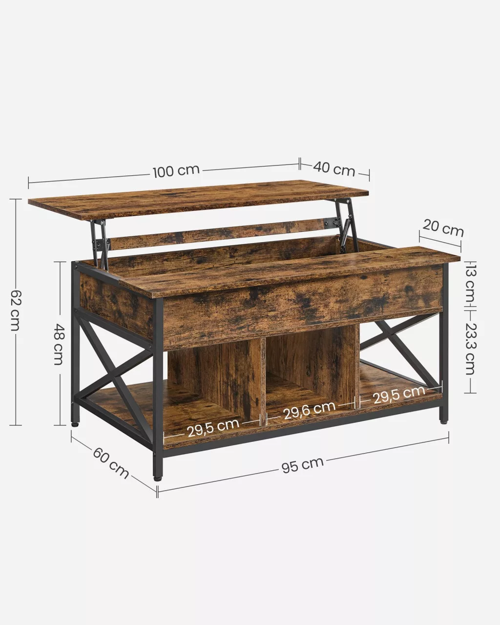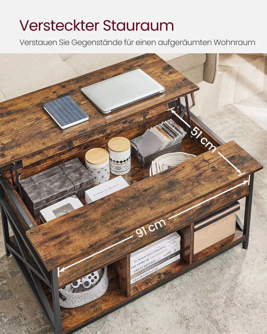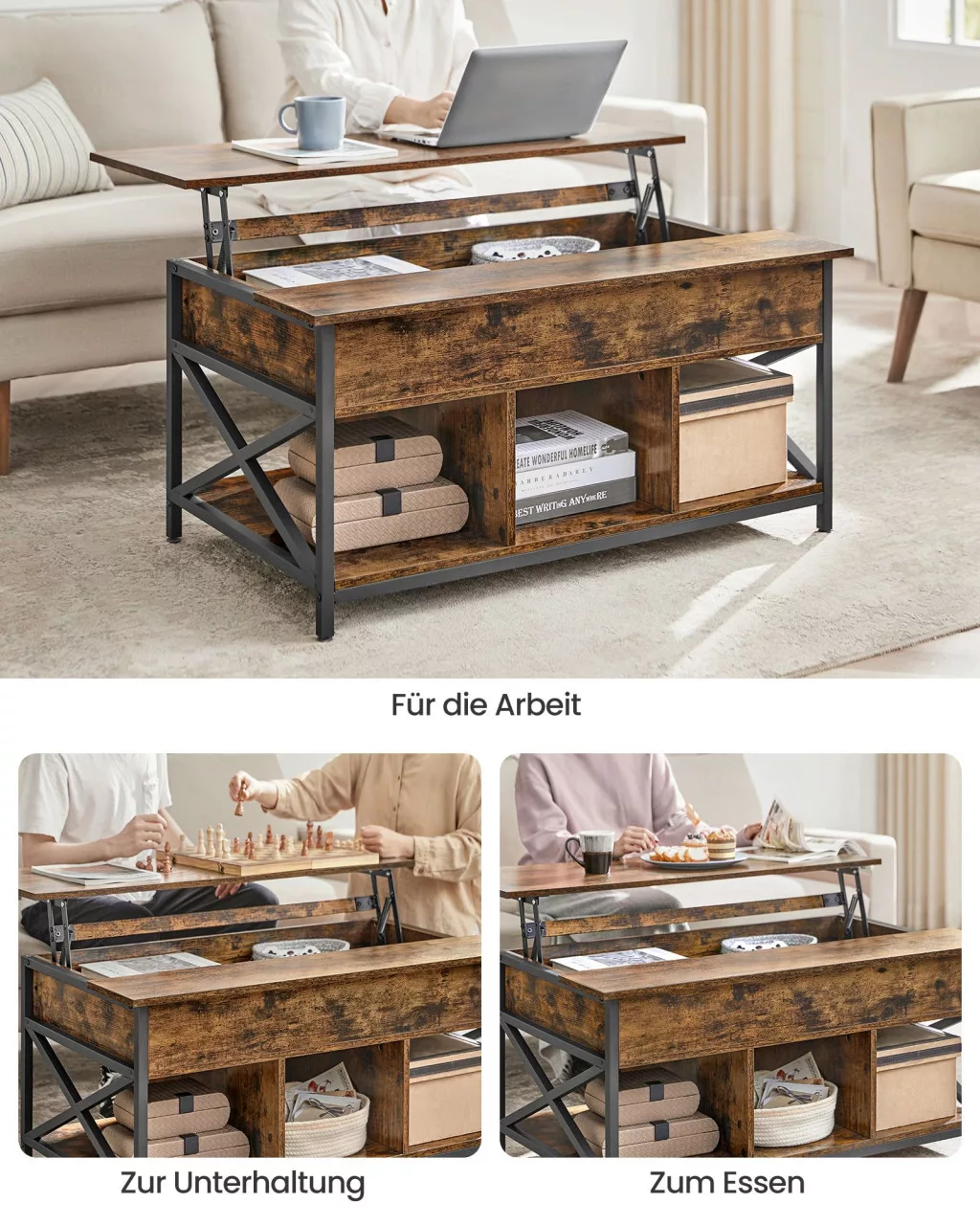 Többfunkciós dohányzóasztal felnyitható lappal, rejtett és nyitott tárolórekeszekkel, amely tökéletesen ötvözi a praktikumot az ipari dizájnnal.