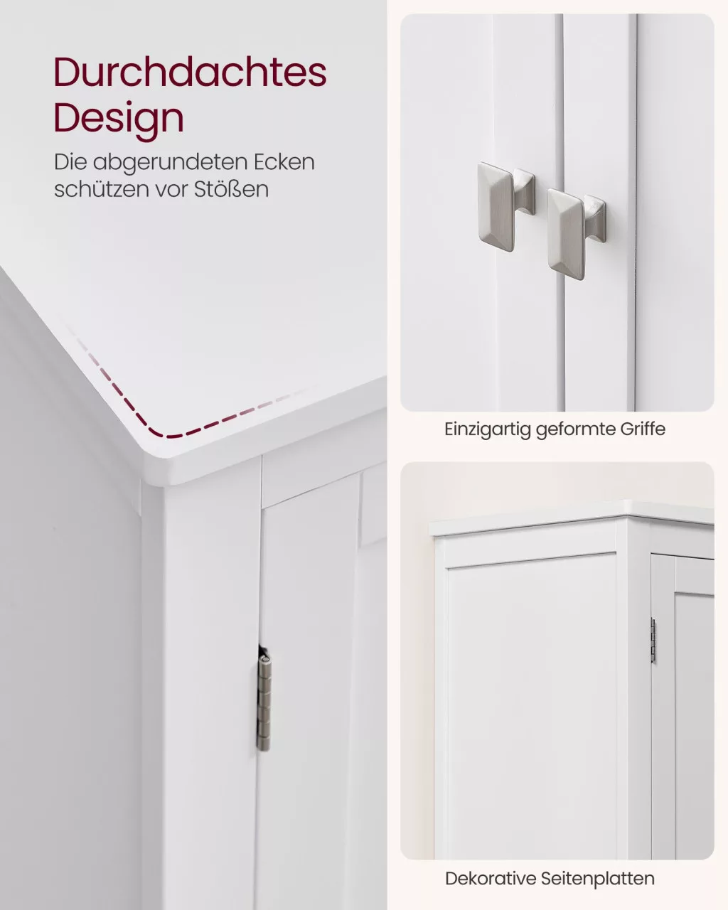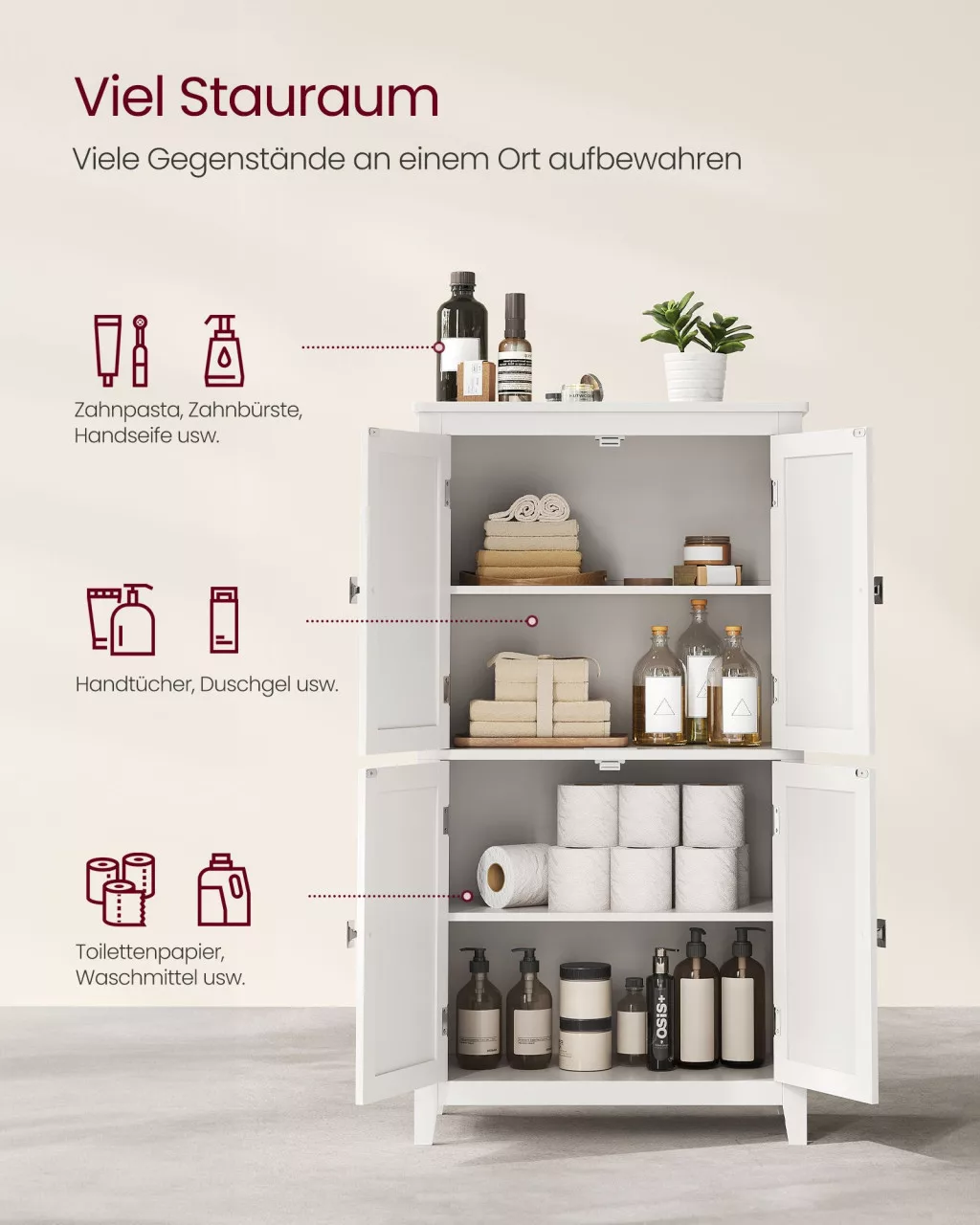 A VASAGLE fürdőszobai tároló szekrény tökéletes választás azok számára, akik praktikus és elegáns tárolási megoldást keresnek. A fehér MDF anyagból készült szekrény két különálló tárolóegységgel rendelkezik, amelyek bőséges helyet kínálnak hajszárító, törölközők, kozmetikumok és egyéb fürdőszobai kellékek számára. A dekoratív panelekkel díszített design modern megjelenést kölcsönöz fürdőszobájának, miközben a masszív konstrukció hosszú élettartamot garantál.