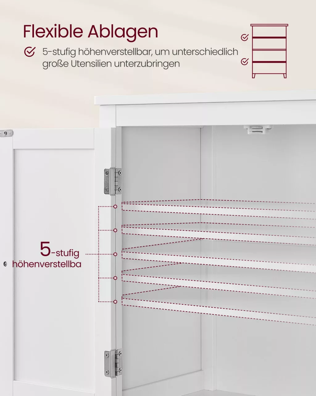 • Állítható polcrendszer, amely 5 különböző pozícióban rögzíthető a különböző méretű tárgyak optimális elhelyezéséhez