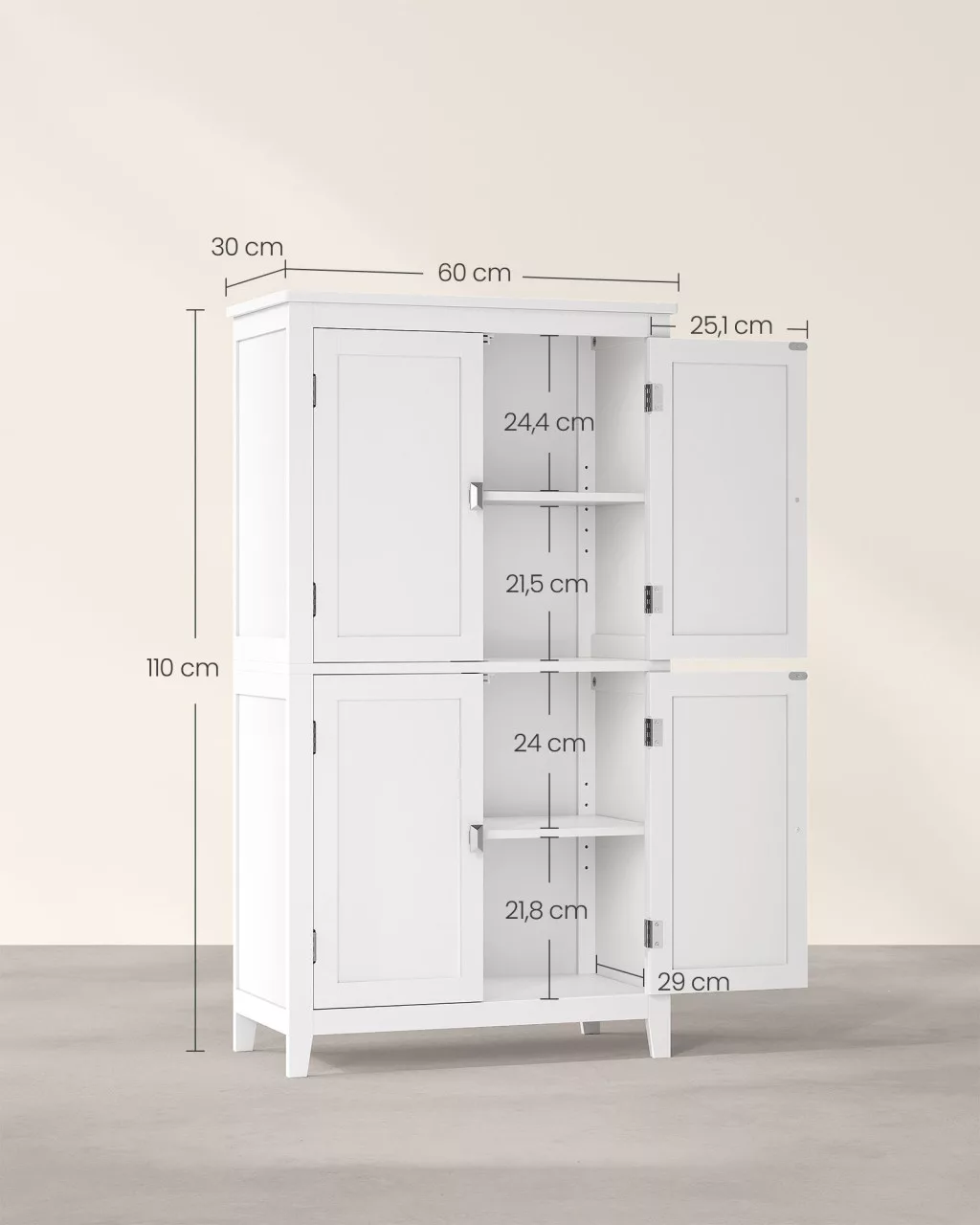 VASAGLE Fürdőszobai Tároló Szekrény MDF Fehér 4 Ajtós Állítható Polcokkal