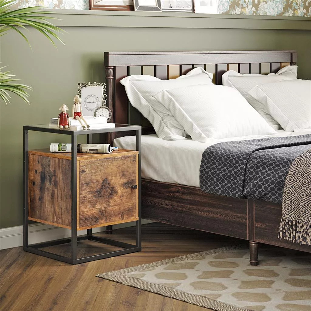 VASAGLE GLATAL Ipari Stílusú Éjjeliszekrény Üveglapos Tárolószekrénnyel Rusztikus Barna