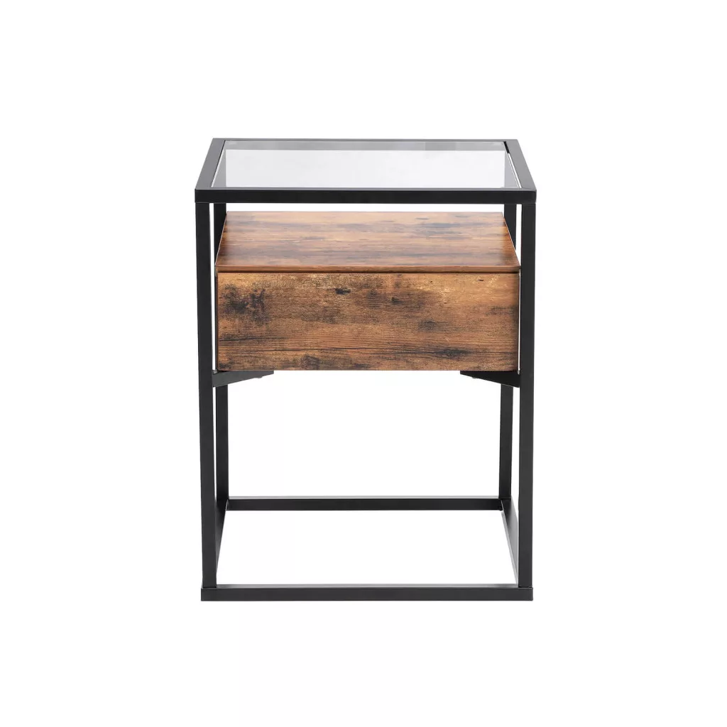 Elegáns üveglapos kisasztal rejtett fiókkal és polccal, amely ötvözi az edzett üveg, acél és rusztikus fa harmóniáját egy modern ipari stílusú bútordarabban.