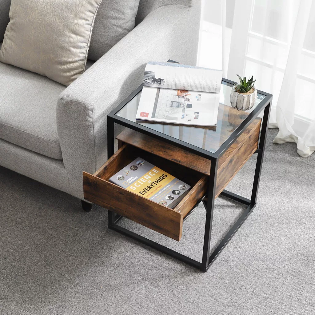 VASAGLE GLATAL Üveglapos Kisasztal Fiókkal Rusztikus Barna-Fekete