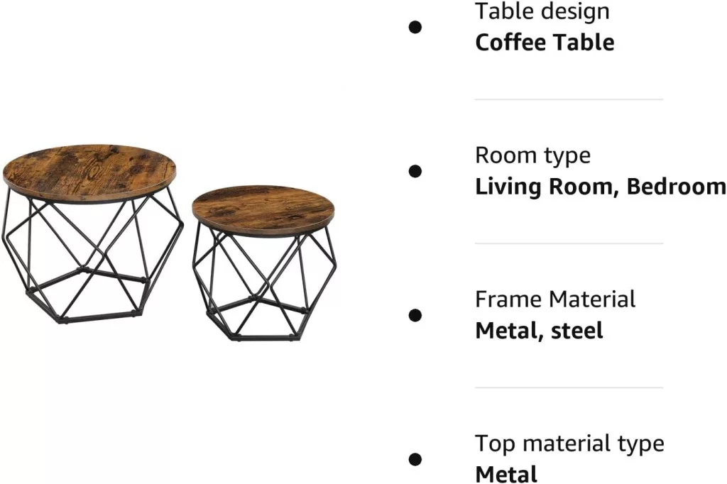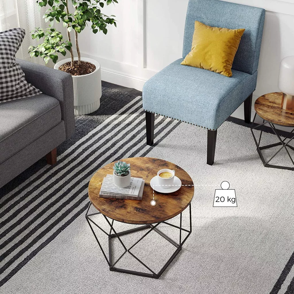 Ez a két darabos VASAGLE dohányzóasztal szett tökéletesen ötvözi az ipari dizájnt a praktikummal. A rusztikus barna asztallap és a geometrikus fekete fémváz modern, mégis időtlen megjelenést kölcsönöz. A nagyobb asztal 50 cm-es átmérőjével központi elemként szolgál, míg a kisebb 40 cm-es társa rugalmasan használható kiegészítőként.