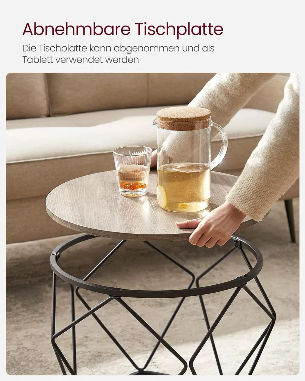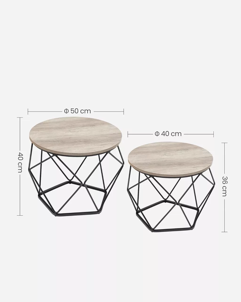 Ez a VASAGLE dohányzóasztal szett egyedi geometrikus designjával és időtlen színkombinációjával azonnal a nappali központi elemévé válik. A nagyobb, 50 cm átmérőjű és a kisebb, 40 cm átmérőjű asztal tökéletesen kiegészítik egymást, miközben a fekete acélváz és a greige színű asztallap harmonikus kontrasztot alkot.