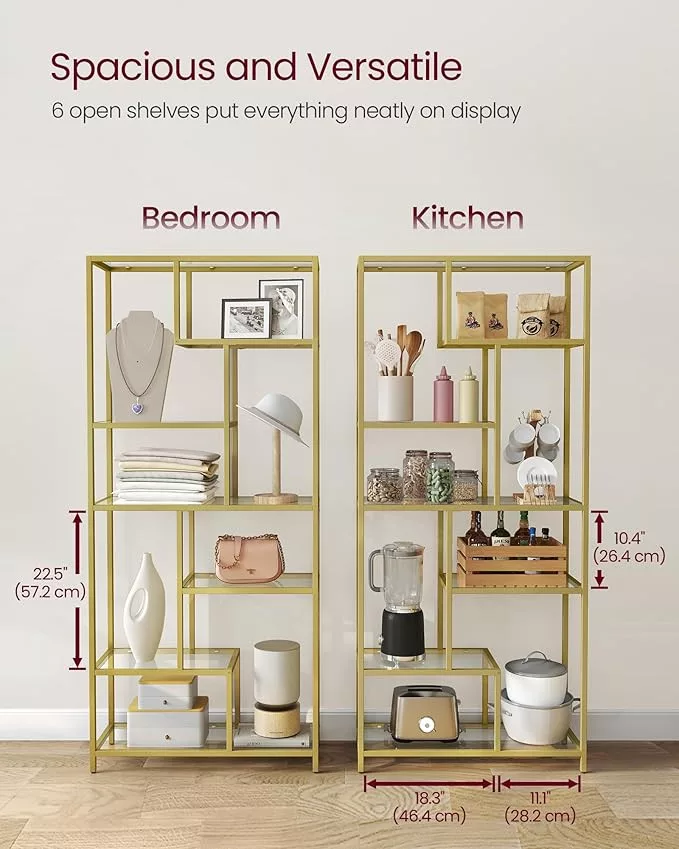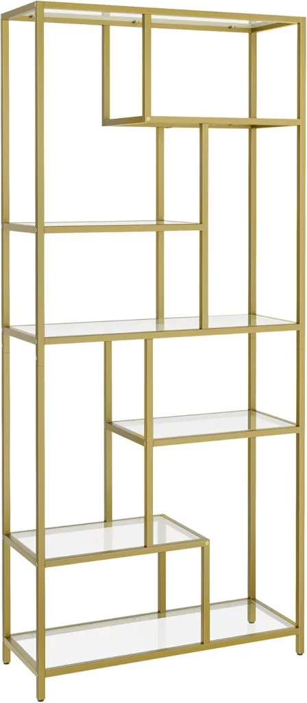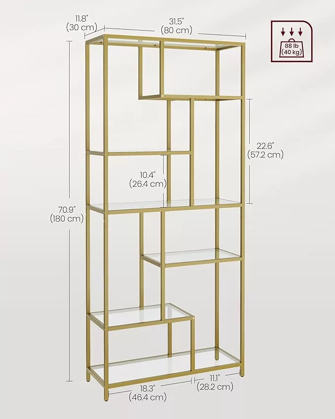 Ez a geometrikus kialakítású, 6 szintes könyvespolc tökéletesen ötvözi a funkcionalitást és az esztétikumot. Az arany színű fémváz és az edzett üvegpolcok elegáns megjelenést kölcsönöznek, míg a különböző magasságú polcok maximális rugalmasságot biztosítanak a tárolásban.