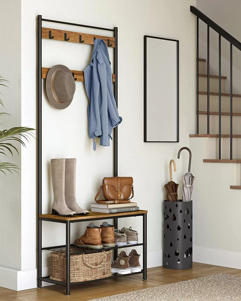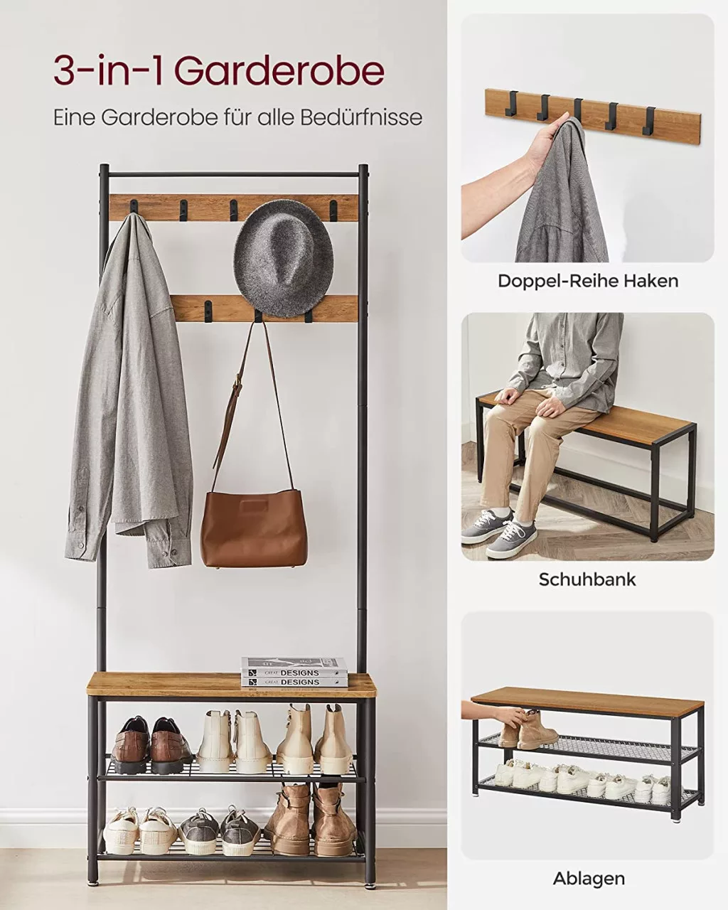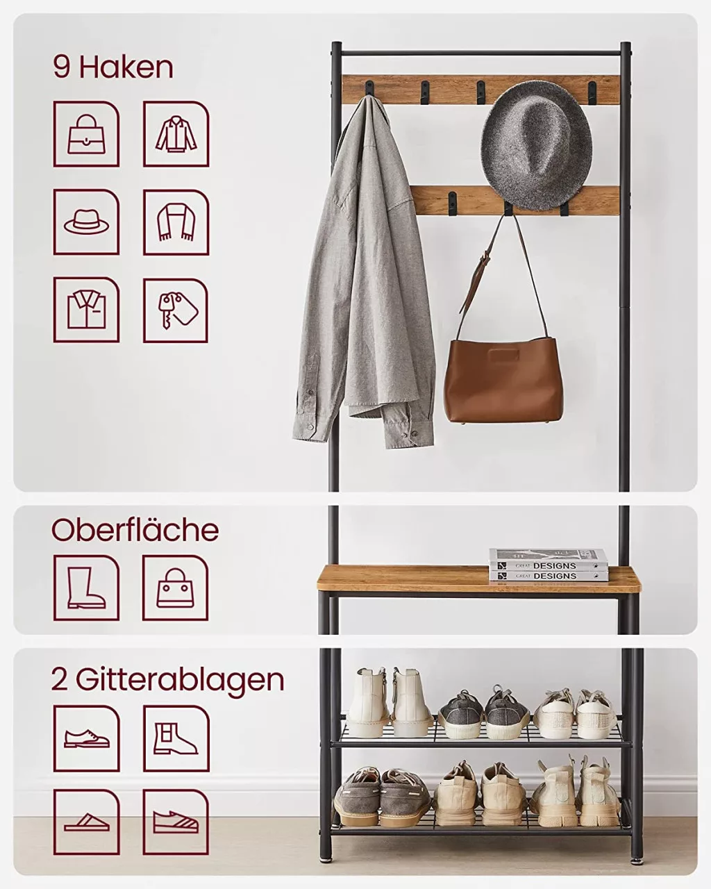 VASAGLE HSR041B41 Előszoba Fogas Cipőtartóval és Ülőkével Diótabarna/Fekete Ipari Dizájn 177 cm
