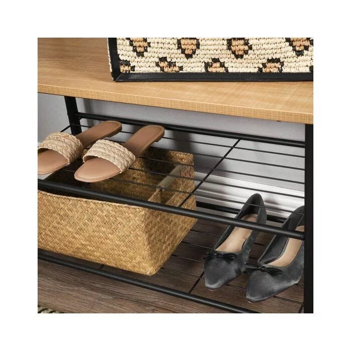 Az állófogas alsó részén található pad kényelmes ülőhelyet biztosít a cipők fel- és levételéhez, míg a két cipőspolc gondoskodik a lábbelik rendezett tárolásáról. A stabil szerkezet és az állítható lábak garantálják a biztonságos használatot.