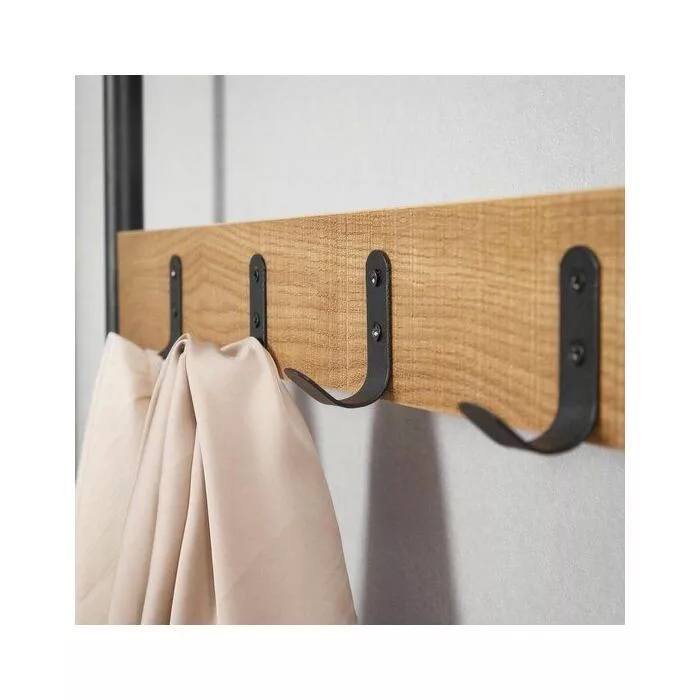 Ez a sokoldalú előszobai állófogas egyesíti magában a praktikusságot és az elegáns megjelenést. A fekete fém váz és a meleg barna fa elemek harmonikus kombinációja modern és időtlen dizájnt kölcsönöz a bútornak. A 9 strapabíró akasztó két sorban helyezkedik el, biztosítva kabátjai, táskái és kiegészítői rendezett tárolását.