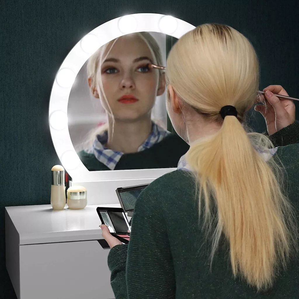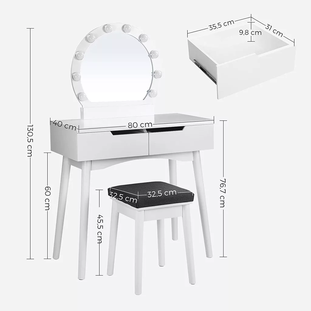 Modern fésülködőasztal szett 10 LED izzóval, nagy kerek tükörrel és kényelmes ülőkével - tökéletes választás a mindennapi szépségápolási rutinhoz.