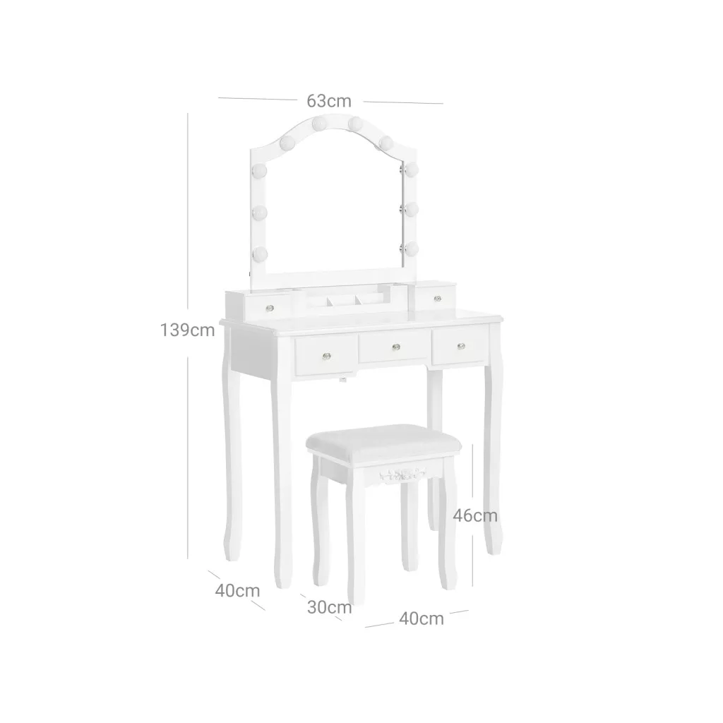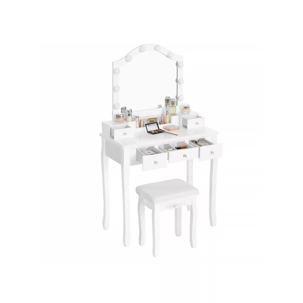Elegáns fehér fésülködőasztal szett 10 LED izzóval, nagy tükörrel, 5 fiókkal és párnázott ülőkével, amely tökéletes megoldást nyújt a mindennapi szépségápolási rutinhoz.