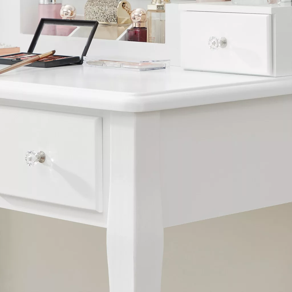 A fehér MDF és tömörfa konstrukció nem csak stabil, de időtlen eleganciát is sugároz. A párnázott ülőke kényelmes helyet biztosít a napi szépségápolási rutin során, a hajlított lábak pedig klasszikus bájt kölcsönöznek a bútornak.