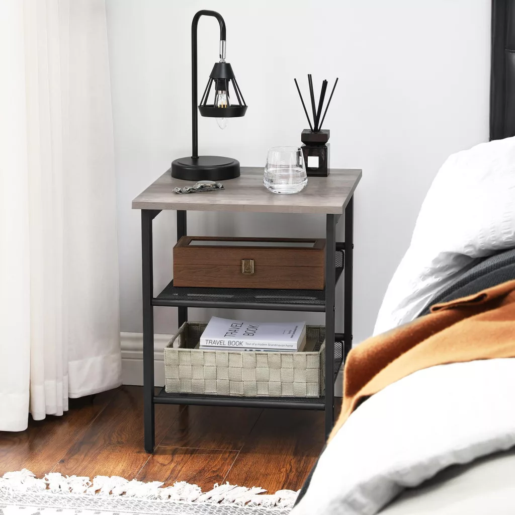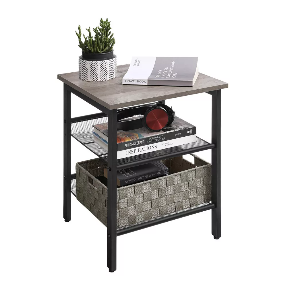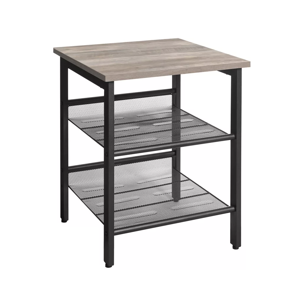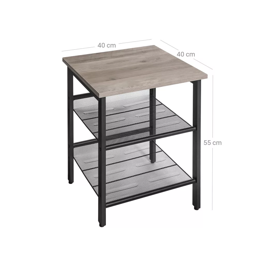 Ez a VASAGLE kisasztal ötvözi a praktikumot és a stílust. A fekete acélváz és a szürkésbarna asztallap modern ipari megjelenést kölcsönöz, miközben a két állítható hálós polc maximális tárolási rugalmasságot biztosít. Az asztallap ideális lámpák, dísztárgyak vagy italok elhelyezésére.