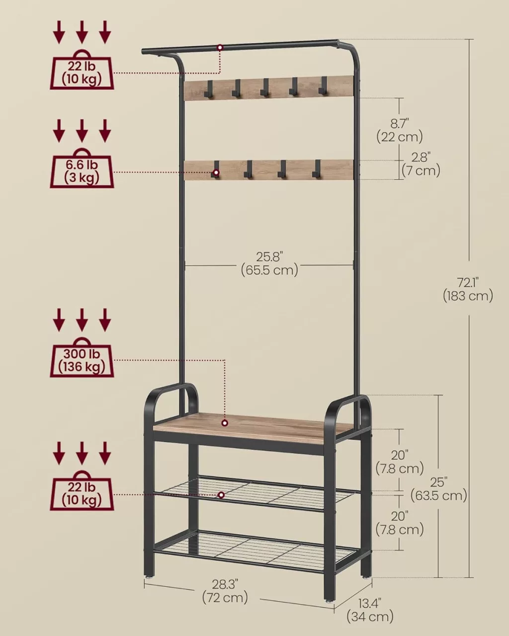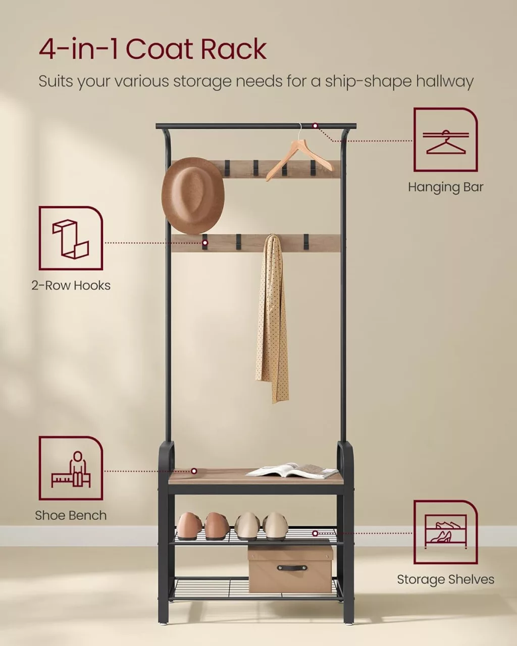VASAGLE Industrial 4-az-1-ben Előszobai Állvány Cipőspolccal Tevebarna-Fekete