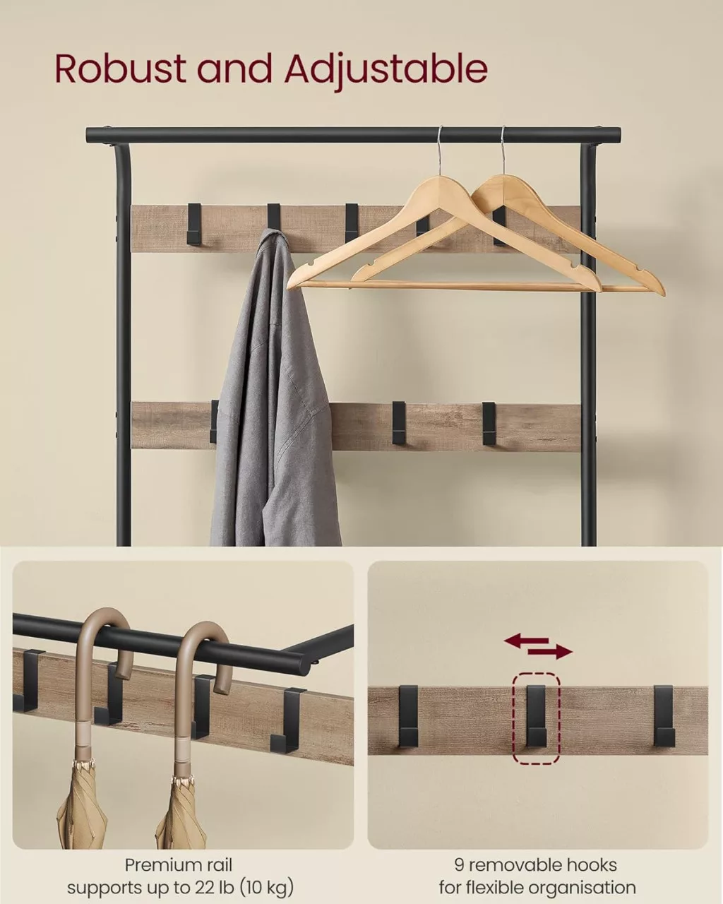 A praktikus kialakítás maximálisan kihasználja a függőleges teret, a 9 levehető akasztóhorog pedig rugalmas tárolási lehetőséget kínál. Az állvány alsó részén található cipőspolcok és ülőpad még praktikusabbá teszik a mindennapi használatot.