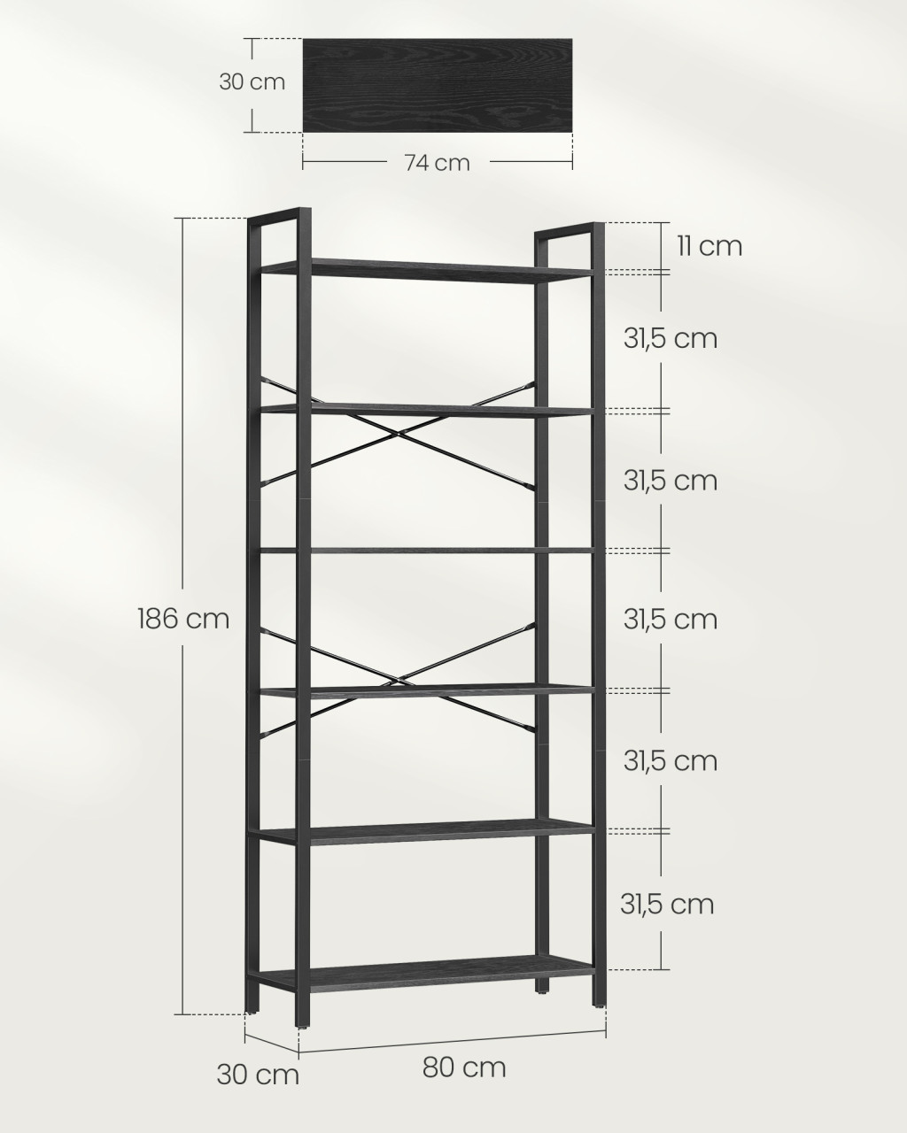 Ez a VASAGLE könyvespolc tökéletesen ötvözi a funkcionalitást és az ipari dizájnt. A 6 tágas polc bőséges helyet biztosít könyvek, dekorációs tárgyak és személyes holmik tárolására, miközben a robusztus acél váz és X-merevítők garantálják a szerkezet stabilitását.