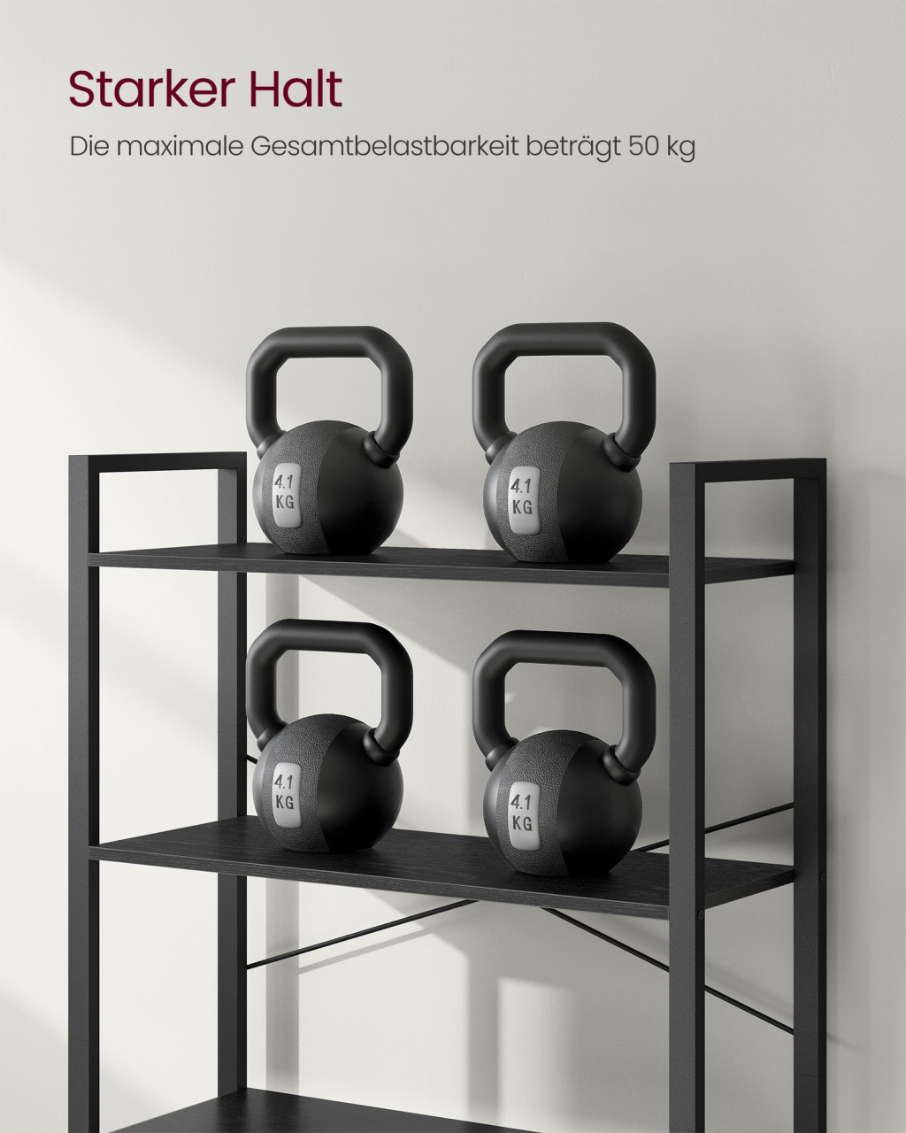 A minőségi faforgácslapból készült polcok és a fekete acél keret időtlen ipari megjelenést kölcsönöznek, amely könnyedén illeszkedik bármilyen modern vagy indusztriális lakberendezésbe. Az állítható lábak és a falhoz rögzítő készlet további biztonságot nyújtanak.
