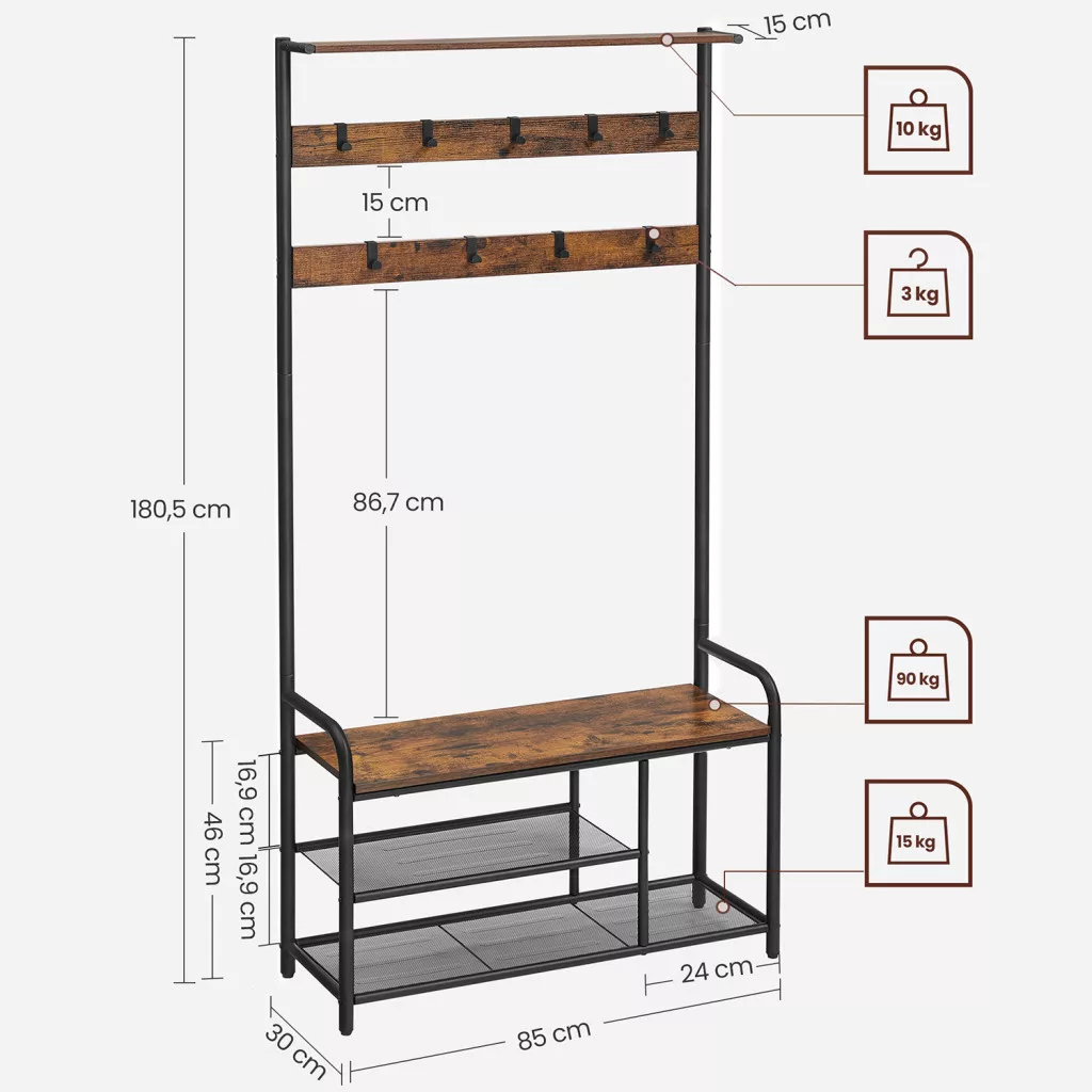 Multifunkcionális előszobai bútor, amely ötvözi a fogast, padot és cipőtárolót egy stílusos ipari dizájnban. 9 akasztóval és 2 cipőtároló polccal rendelkezik.