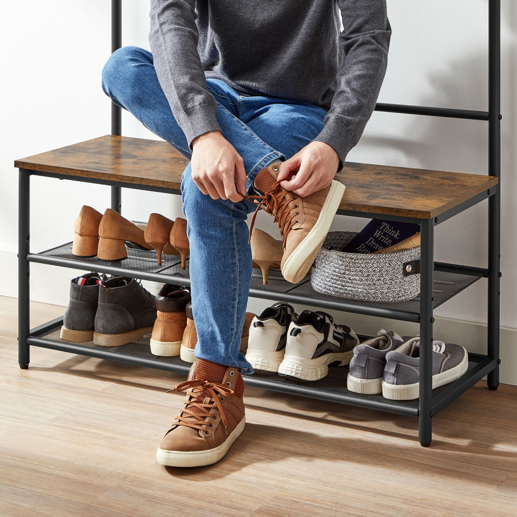 VASAGLE Industrial Előszobai Állvány Cipőspolccal és Paddal Rusztikus Barna-Fekete