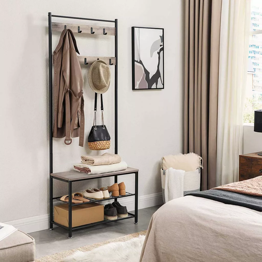 VASAGLE Industrial Előszobai Állvány Cipőtárolóval és Paddal Greige-Fekete