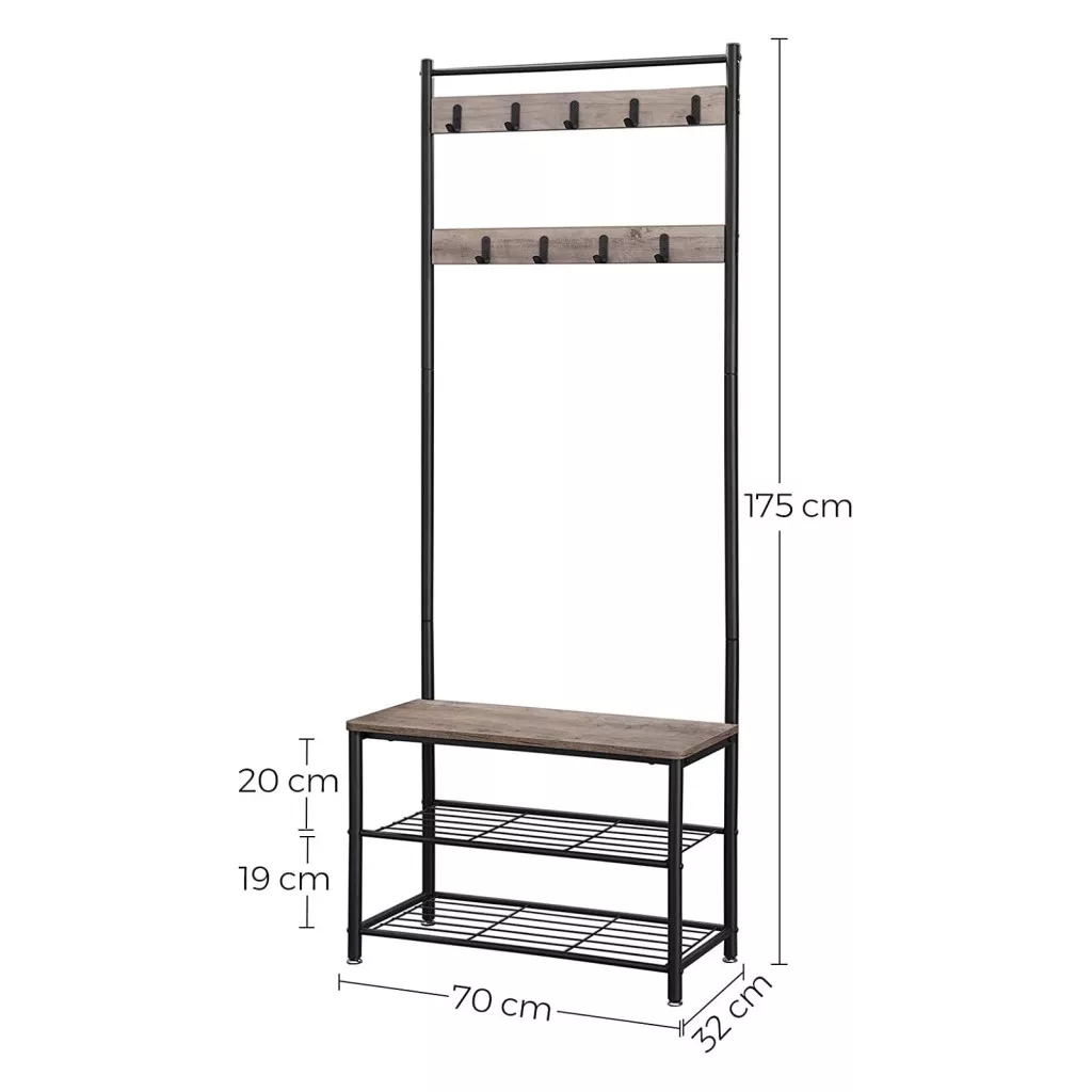 A 9 erős akasztó két sorban helyezkedik el, biztosítva kabátjai, táskái és kiegészítői rendezett tárolását. Az állvány alsó részén található pad kényelmes ülőhelyet biztosít, míg a két cipőtároló polc segít rendben tartani lábbelijeit.