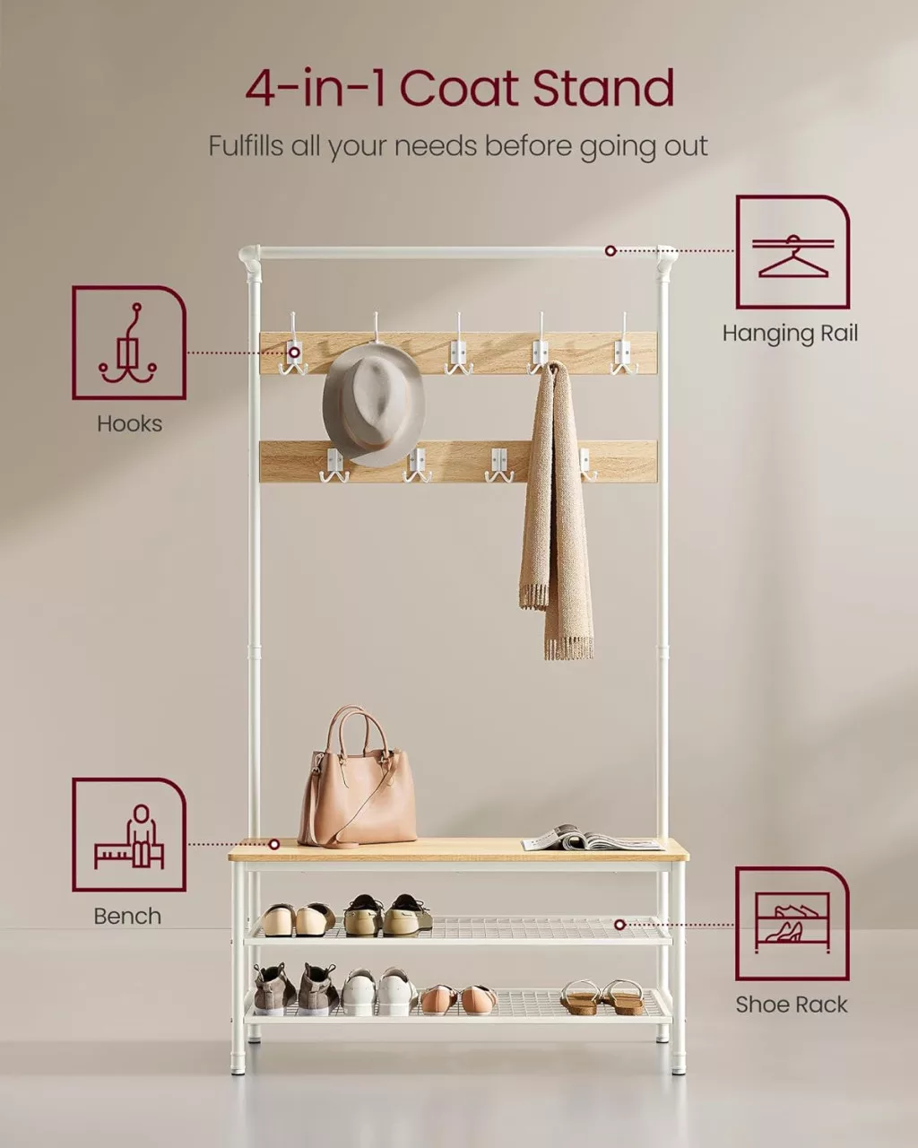 • 4-az-1-ben multifunkciós kialakítás: pad, cipőtároló, akasztók és ruhaakasztó rúd