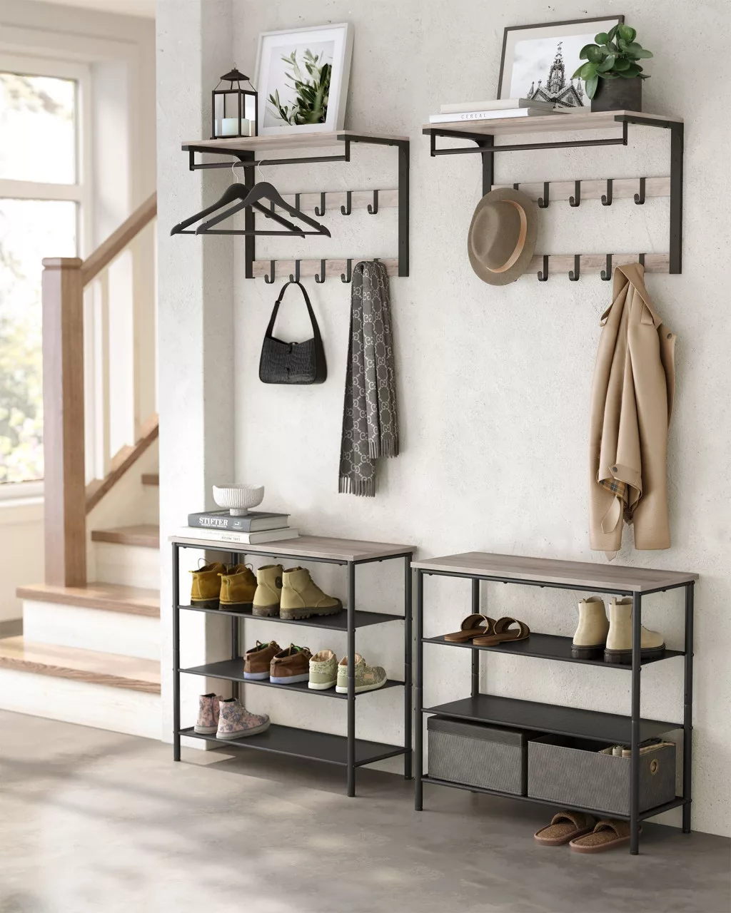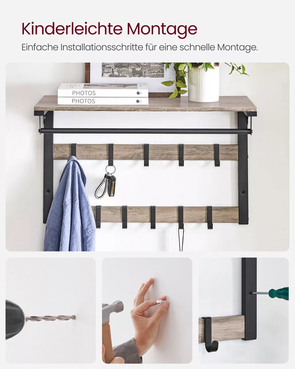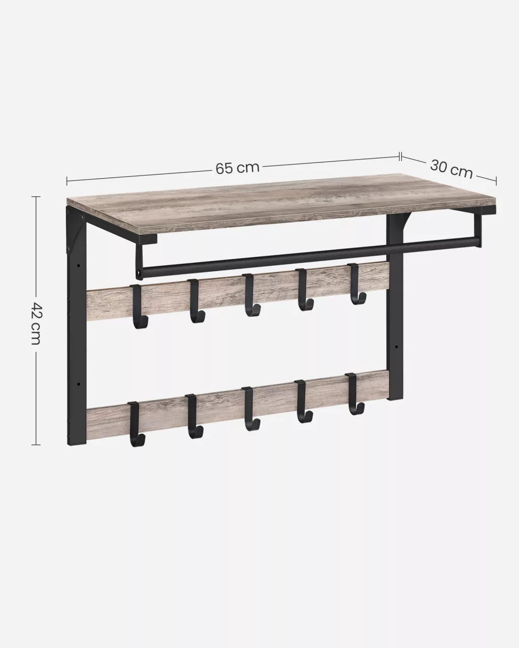Ez a VASAGLE fali fogas ötvözi a praktikumot és a stílust. A felső polc, a két sorban elhelyezett 10 levehető akasztó és a ruhaakasztó rúd maximális tárolási rugalmasságot biztosít. A szürke-fekete színkombináció és az ipari stílusú kialakítás modern megjelenést kölcsönöz otthonának.