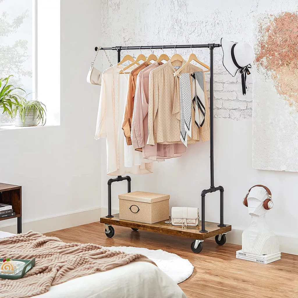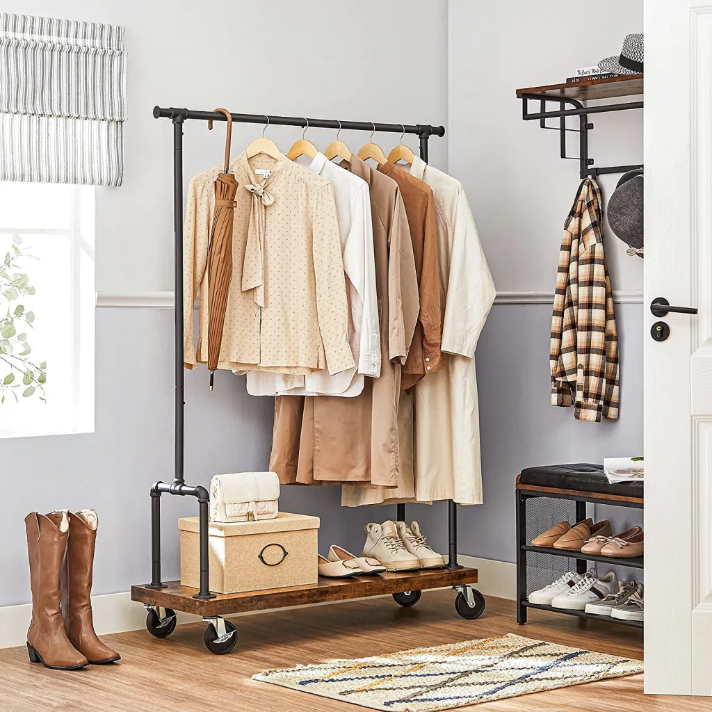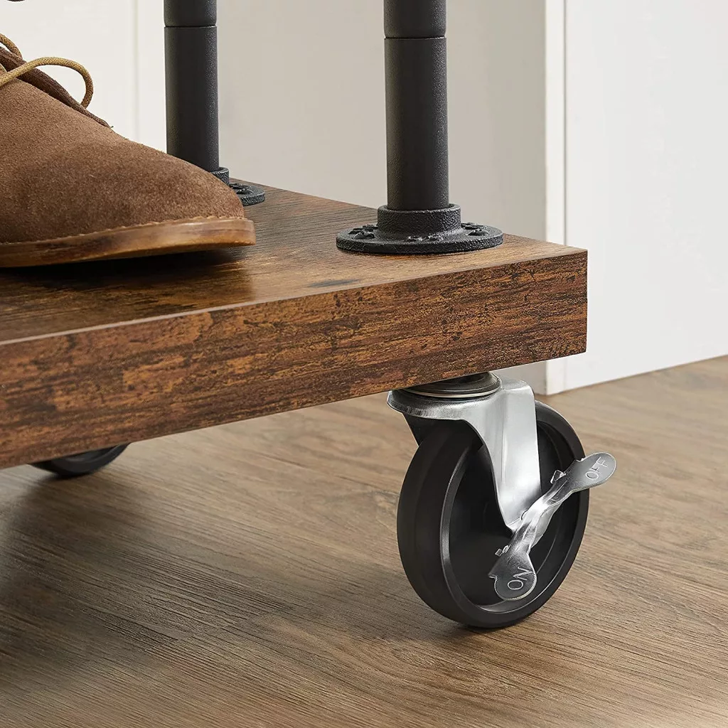 VASAGLE Industrial Kihúzható Ruhaállvány Polccal és Kerekekkel Rusztikus Barna-Fekete