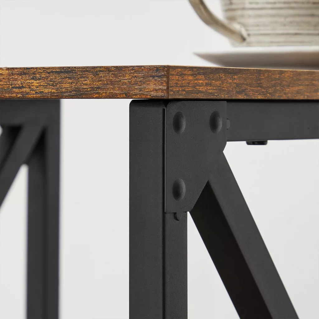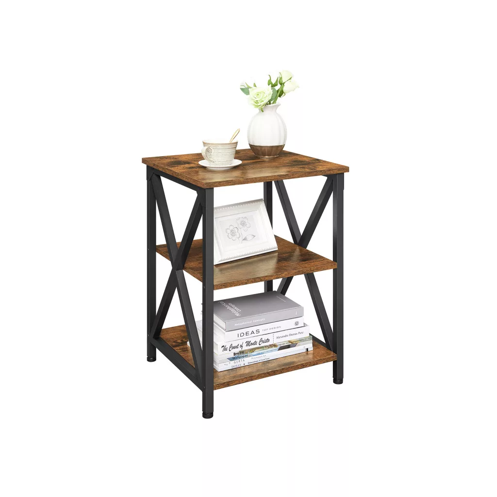 Ez a VASAGLE kisasztal tökéletesen ötvözi az industrial és farmhouse stílust az X-alakú acélváz és a rusztikus barna felületek harmonikus kombinációjával. A három tárolószint maximális funkcionalitást biztosít, miközben a 40x40 cm-es kompakt méret lehetővé teszi, hogy bárhol elhelyezze otthonában.