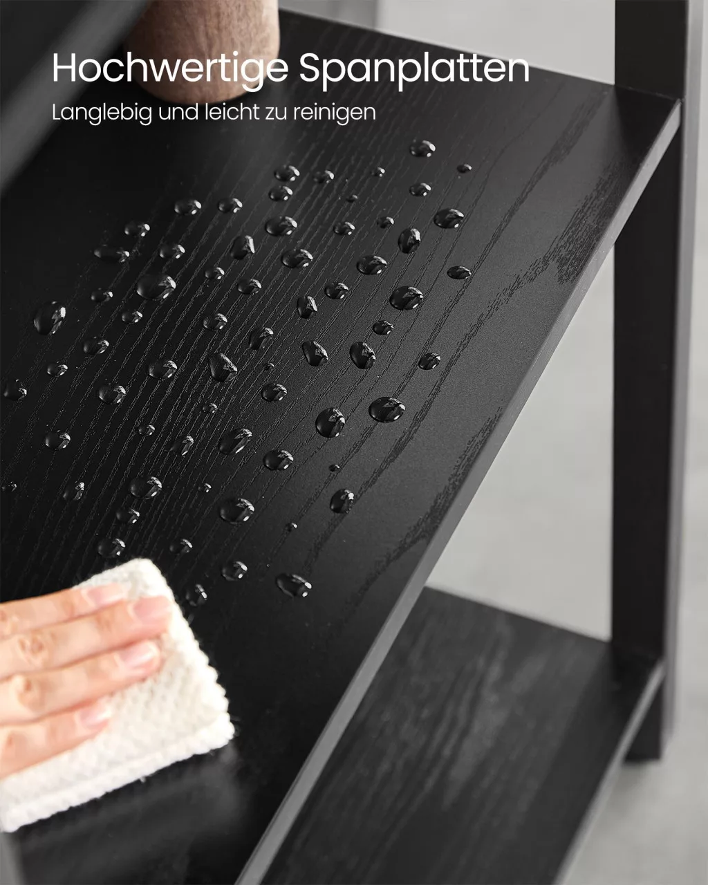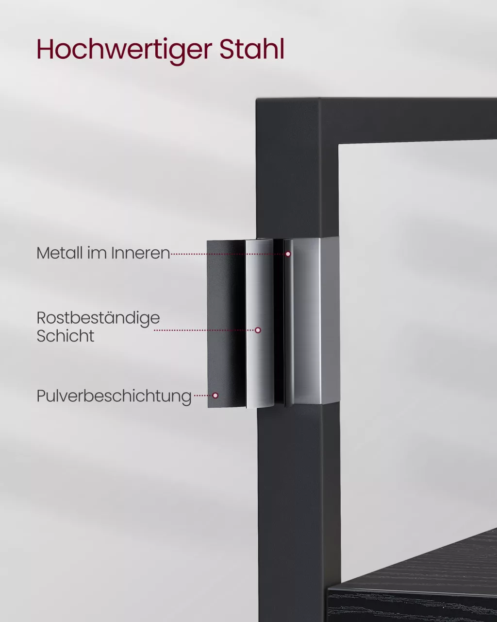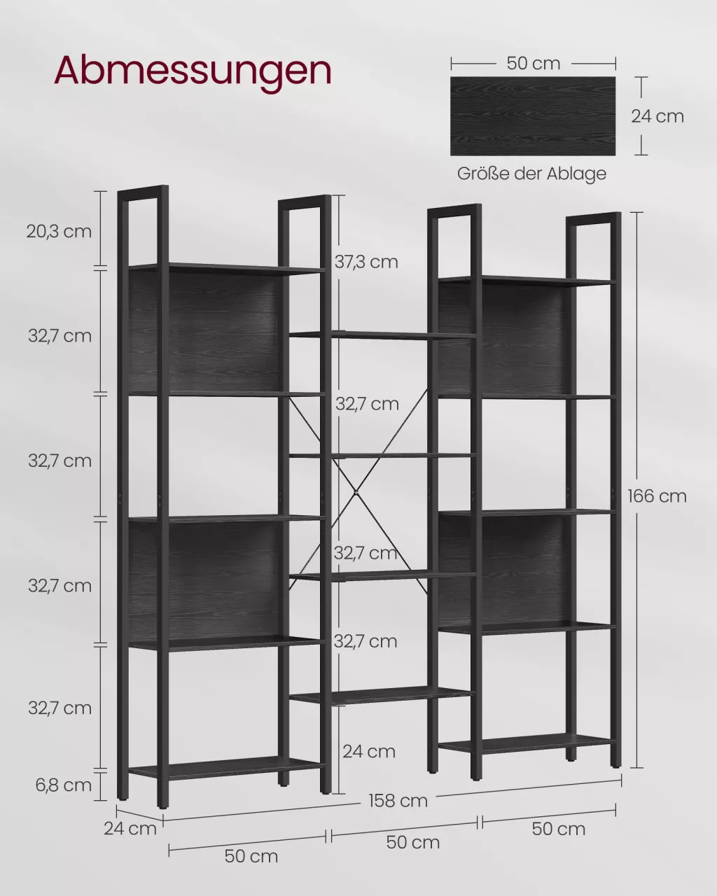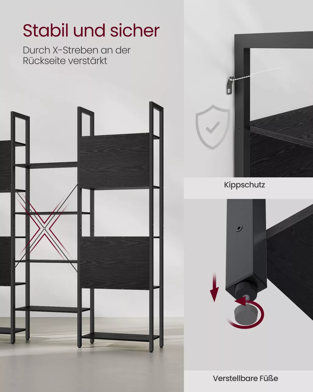 A hátsó X-merevítők és az állítható lábak tovább fokozzák a stabilitást, míg a hátsó védőpanelek megakadályozzák a tárgyak leesését. A polcrendszer tökéletesen illeszkedik bármely modern vagy ipari stílusú enteriőrbe.